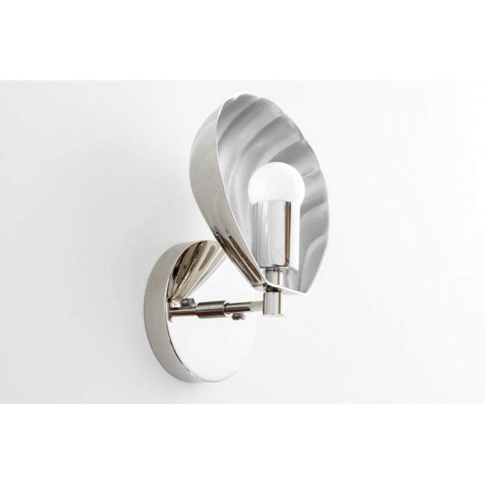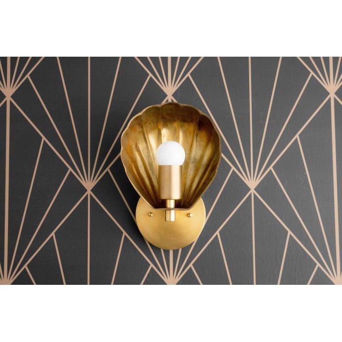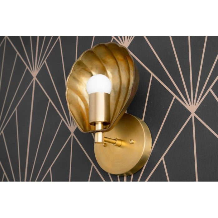 Verleihen Sie mit dieser Art-Déco-Wandleuchte authentischen Charakter. Die massive Messingkonstruktion ist handgereinigt und unbehandelt. Sie altert mit der Zeit und entwickelt eine einzigartige Patina. Der ikonische Muschelschirm verleiht der Leuchte eine luxuriöse, organische Textur. Ein perfektes Statement für traditionelle und moderne Interieurs.