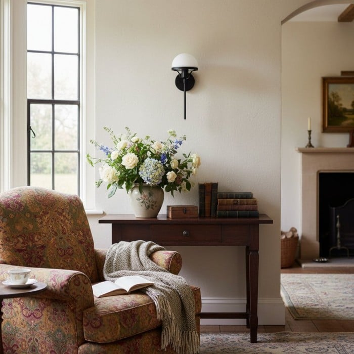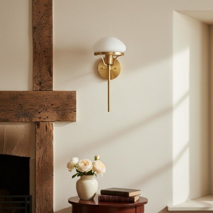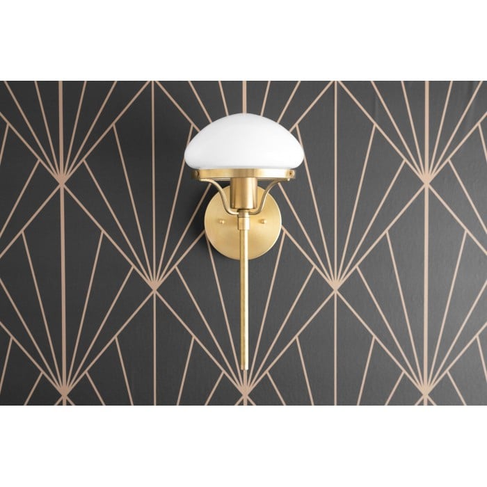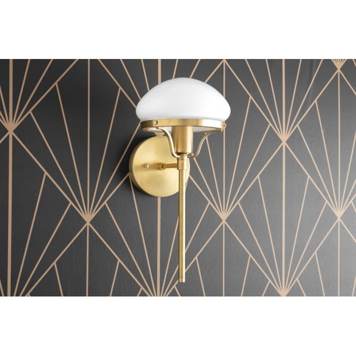 Diese Wandleuchte im klassischen Art-déco-Stil kombiniert einen weißen Opalglasschirm mit massivem Messing oder satiniertem Schwarz. Ihr 38 cm großer Rahmen und die skulpturale Form bilden einen raffinierten Blickfang. Ideal für Flure, Schlafzimmer oder Wohnräume, die Stil und Funktionalität zugleich suchen.