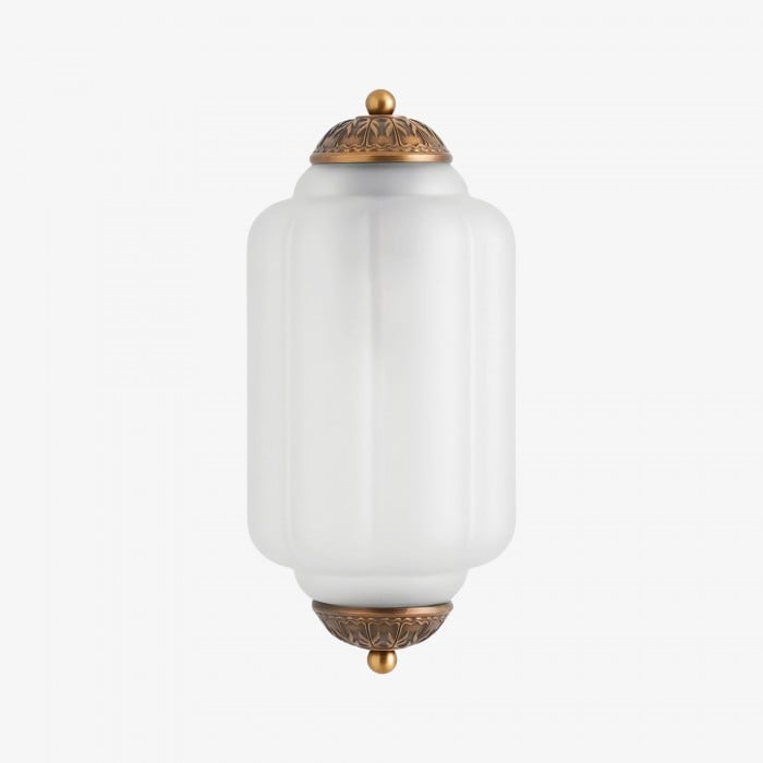 Mit ihrem glatten Milchglas und dem antiken Messingsockel strahlt die Wandleuchte Eloise Vintage-Eleganz aus. Sie spendet weiches, diffuses Licht und verleiht Schlafzimmern, Fluren und gemütlichen Wohnräumen Eleganz.