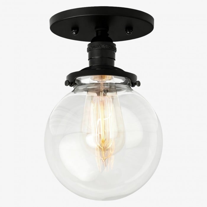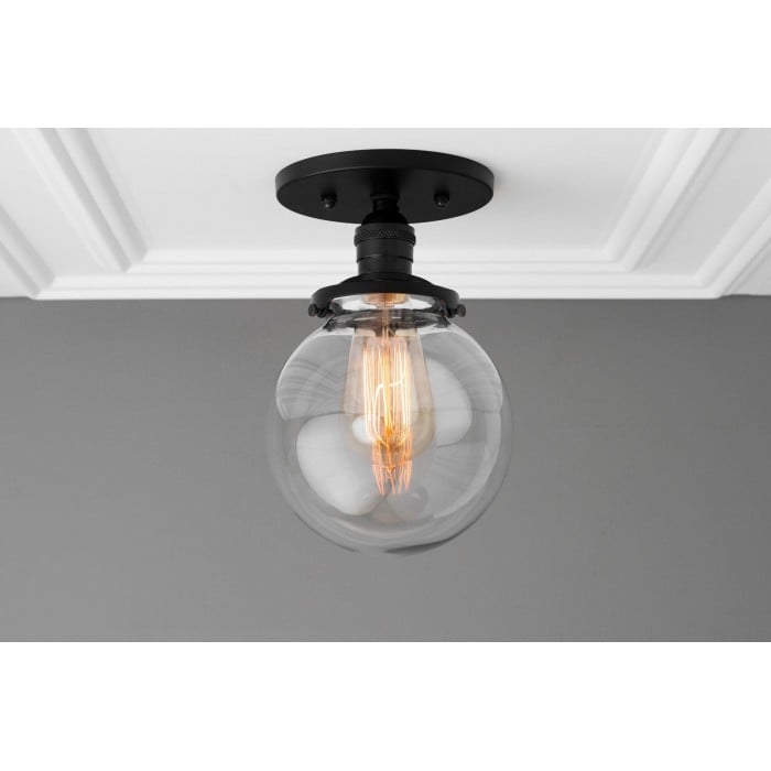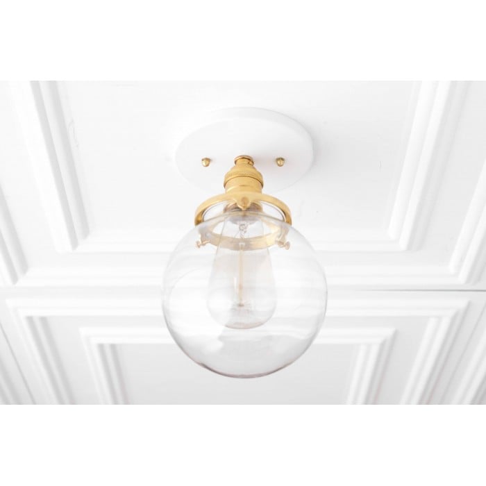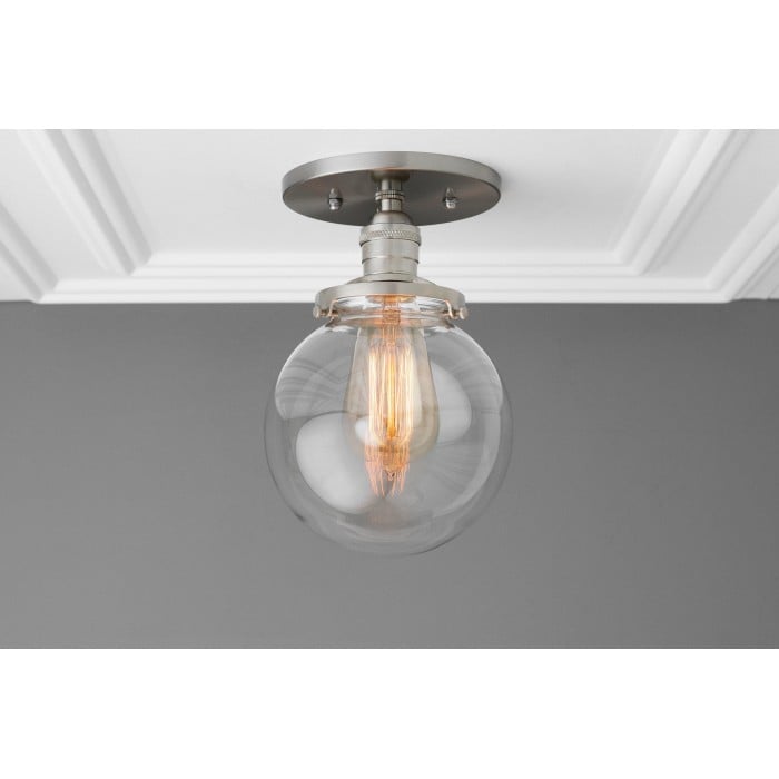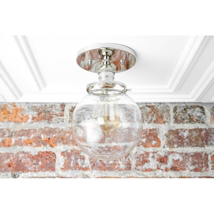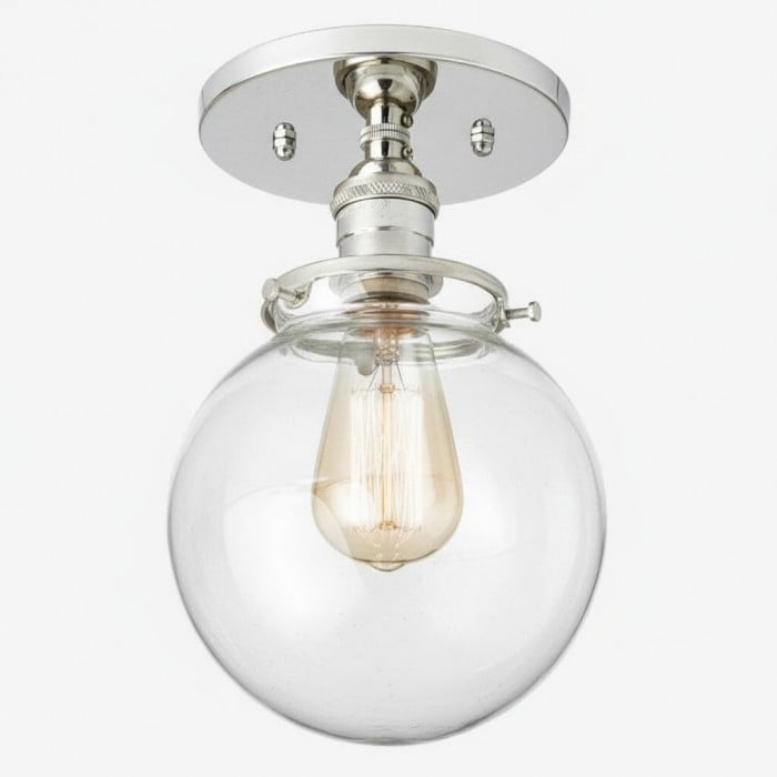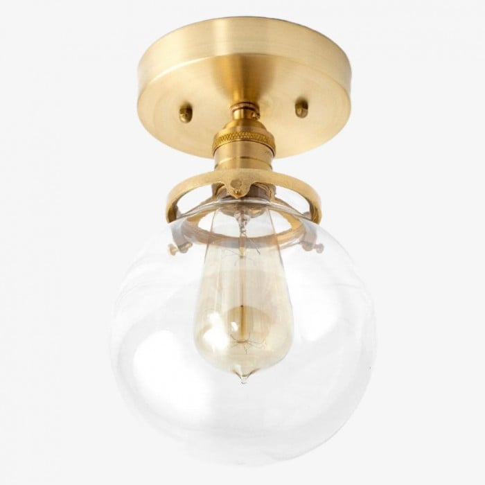 Unsere Vintage-Deckenleuchte verfügt über einen stabilen Metallsockel und eine klare Glaskugel, die ein warmes, einladendes Licht erzeugt. Perfekt, um Ihrer Küche, Ihrem Flur oder Ihrem Schlafzimmer eine nostalgische, kantige und dennoch raffinierte Note zu verleihen. Dieses Stück verbindet gekonnt Retro-Charakter mit modernem Feingefühl.