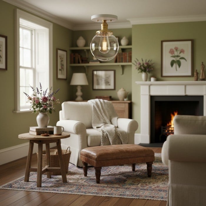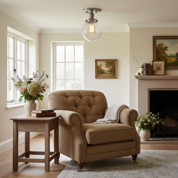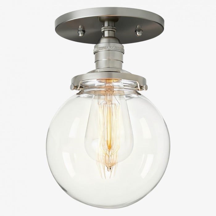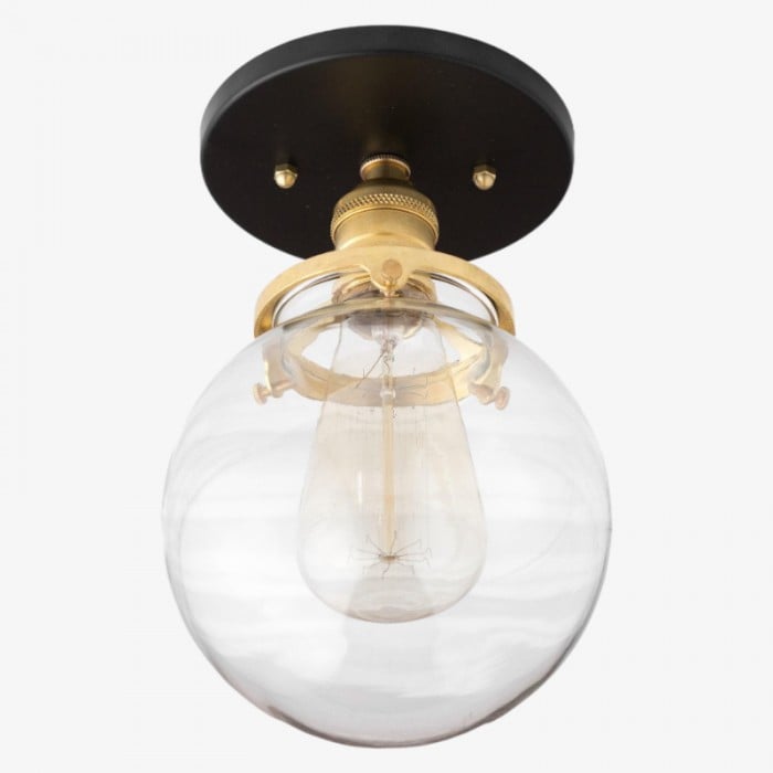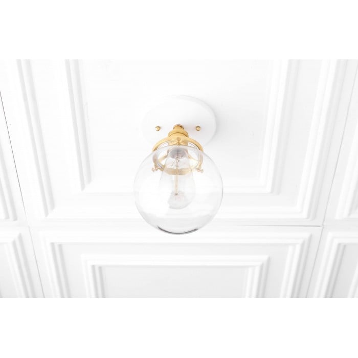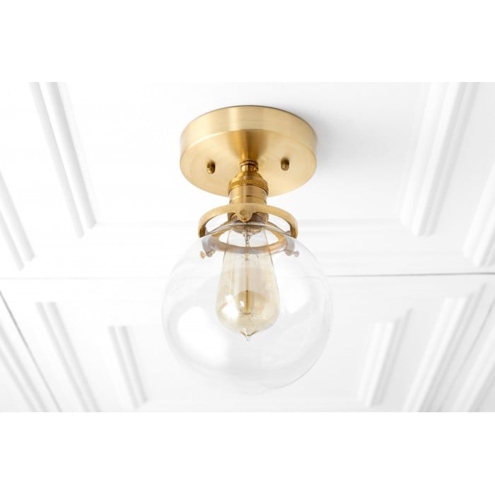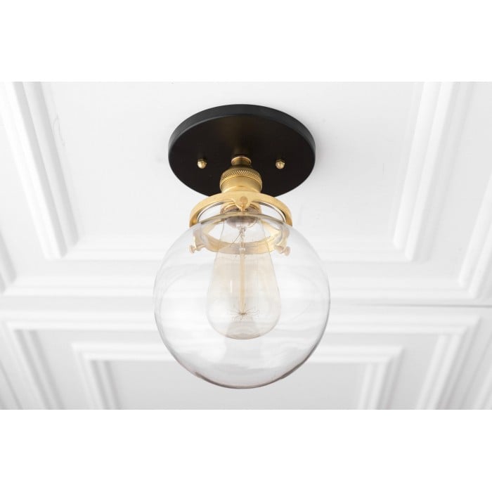 Unsere Vintage-Deckenleuchte verfügt über einen stabilen Metallsockel und eine klare Glaskugel, die ein warmes, einladendes Licht erzeugt. Perfekt, um Ihrer Küche, Ihrem Flur oder Ihrem Schlafzimmer eine nostalgische, kantige und dennoch raffinierte Note zu verleihen. Dieses Stück verbindet gekonnt Retro-Charakter mit modernem Feingefühl.