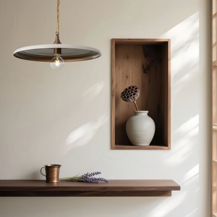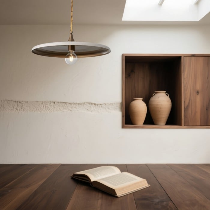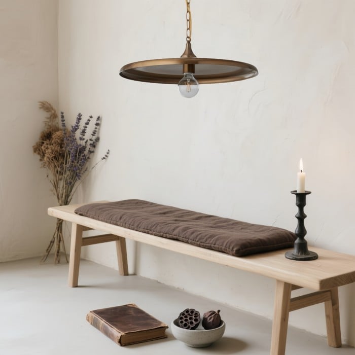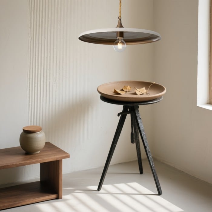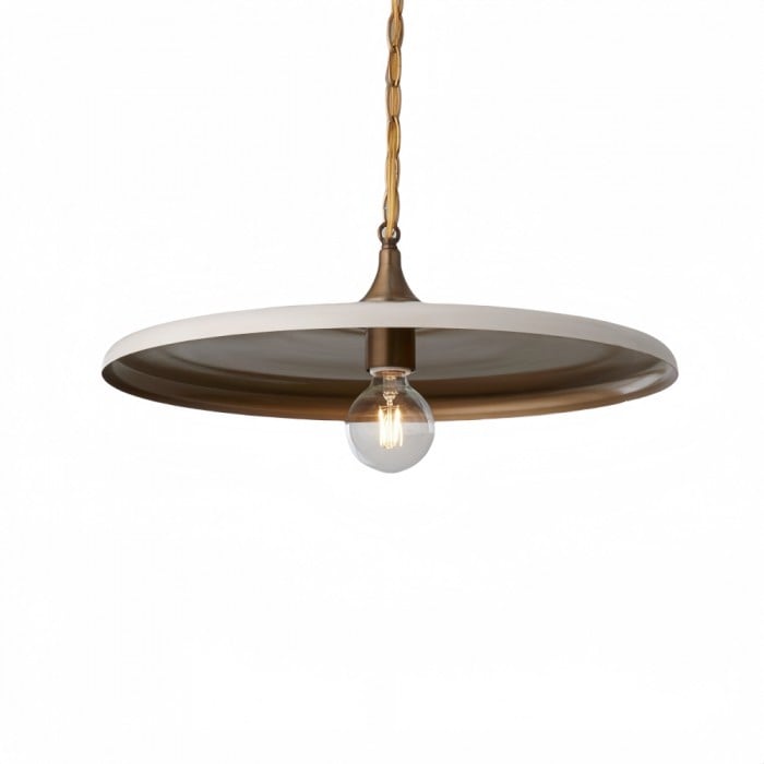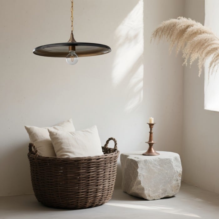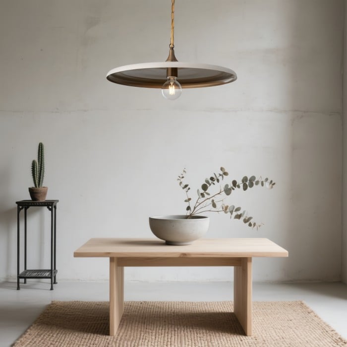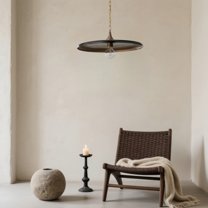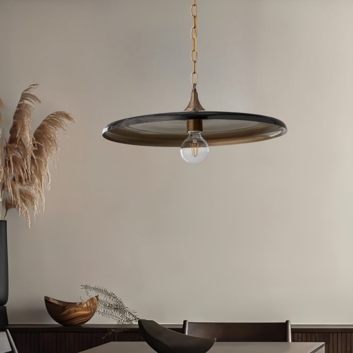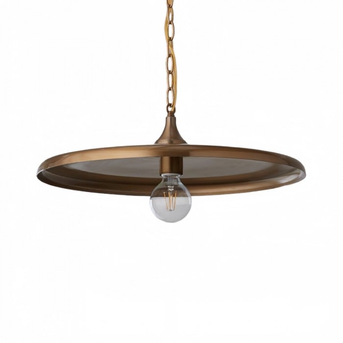Diese Pendelleuchte aus Metall besticht durch ihre schlichte Scheibenform mit minimalistischem Industrie-Charme. Die Pendelleuchte setzt ein markantes geometrisches Statement und sorgt gleichzeitig für fokussiertes Licht nach unten. Perfekt über Kücheninseln oder Esstischen kombiniert diese Kugel-Pendelleuchte funktionale Beleuchtung mit skulpturaler Eleganz.