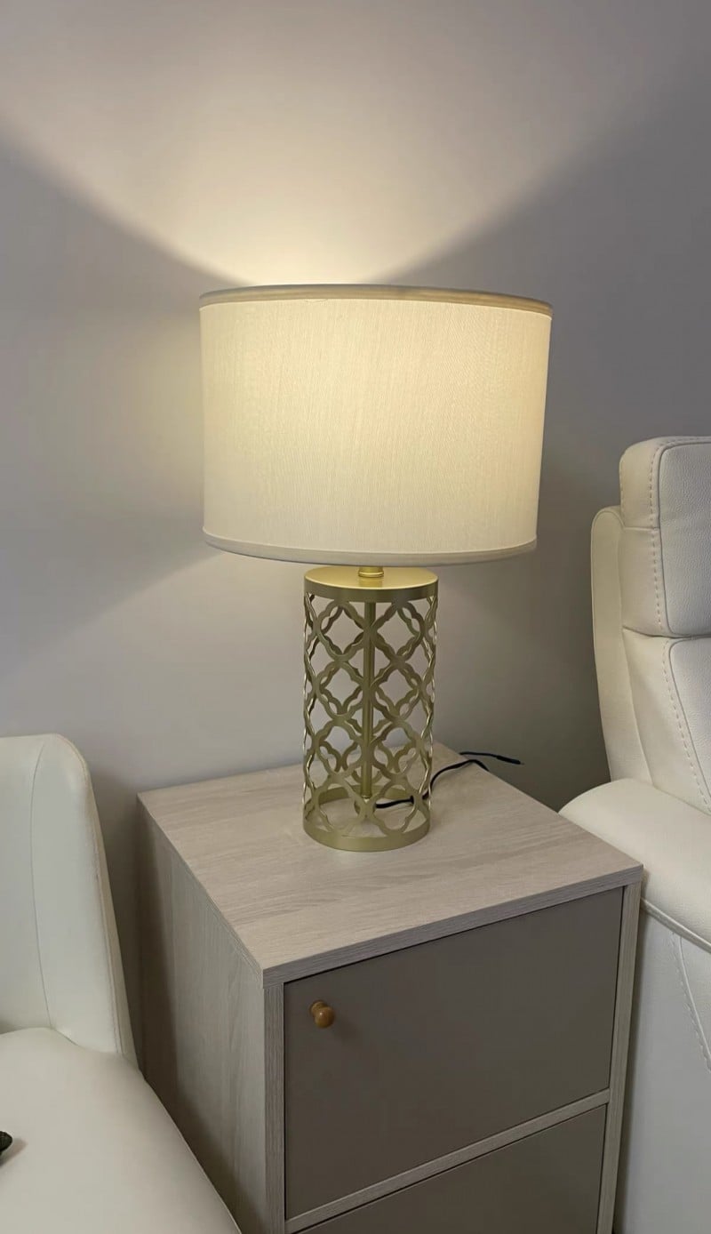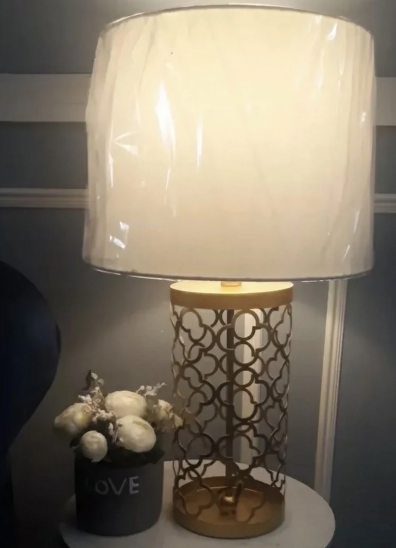Die durchbrochene Metalltischlampe ist ein leicht luxuriöses Design. Durchbrochener goldener Metallsockel und ein satinierter Lampenschirm machen ihn zart und elegant. Es ist eine gute Dekoration in Ihrem Wohnzimmer.- Bitte beachten Sie, dass Ihre Zahlung keine Zölle, lokale Steuern oder andere Einfuhrgebühren enthält. Die Bestellung enthält keine Glühbirnen.