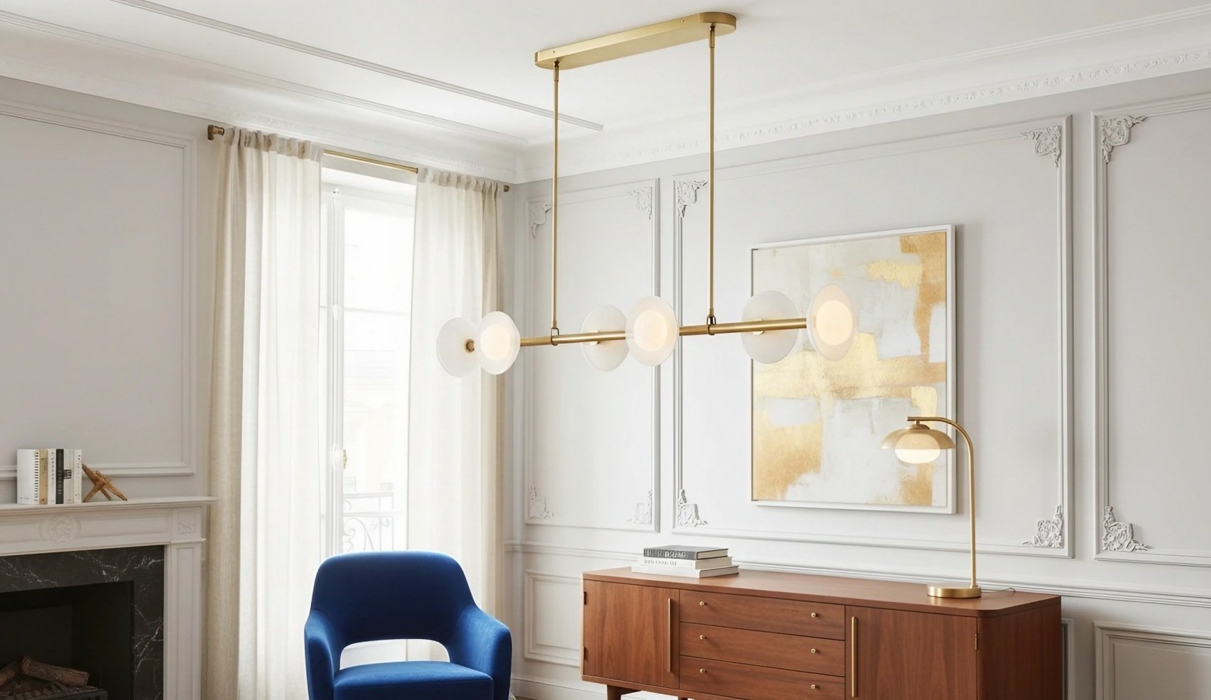 A cylindrical linen shade emits a uniform, ambient glow, its clean form complemented by polished brass hardware for a balanced aesthetic.