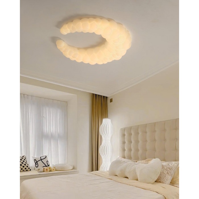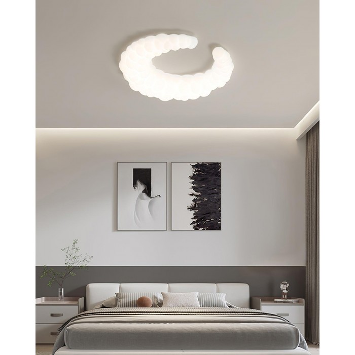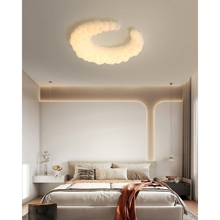 The contemporary ceiling lamp in white finishes can go with any style of decor The Moon-shaped shade resembles the aura in the air. Furthermore, the light is a halo-shaped ring as well as the bulbs that are LED built into the frame, brimming with sentimental love.