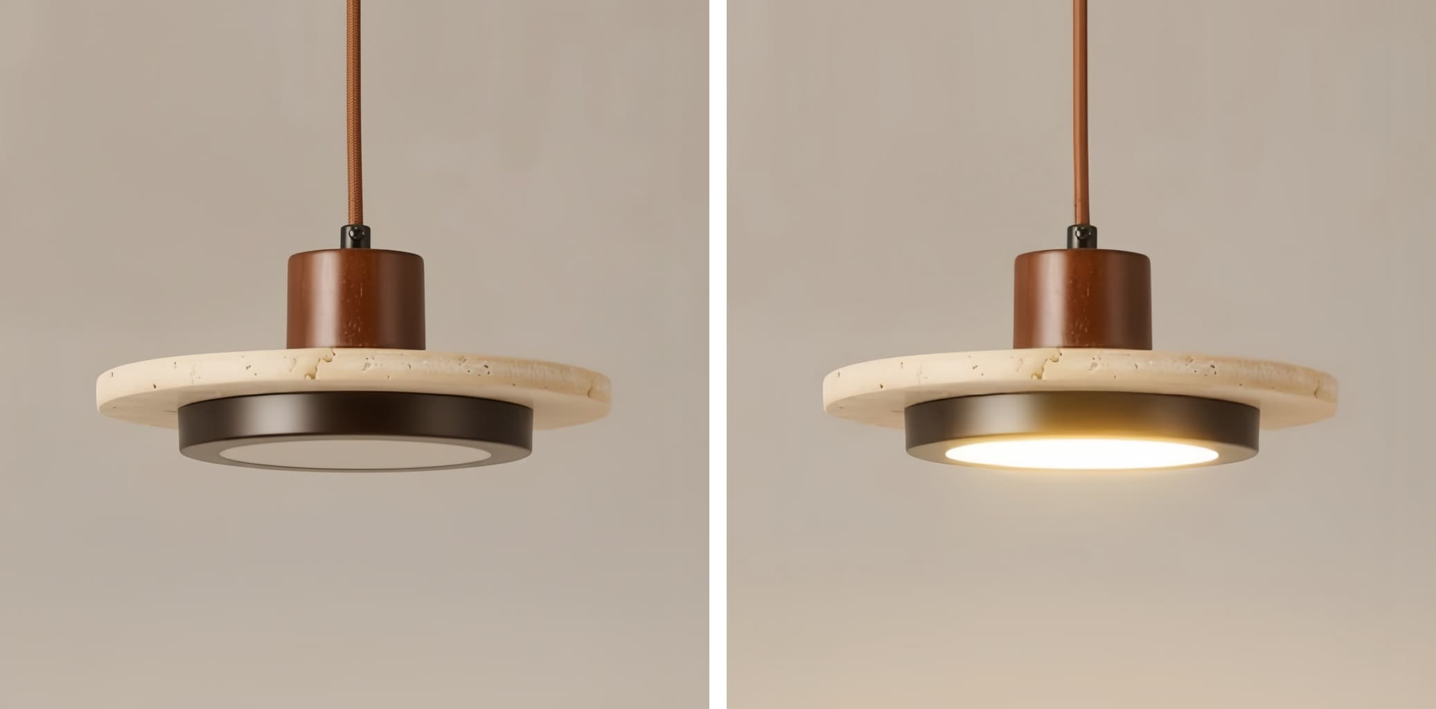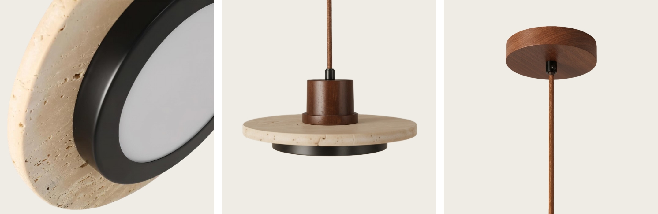 This modern disc pendant blends natural textures with a clean circular profile. A travertine accent and wood detail create warm, organic contrast, making it an elegant fit for dining areas, kitchens, and contemporary living spaces.