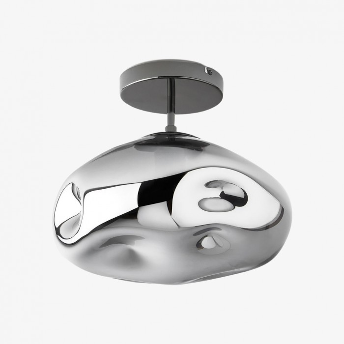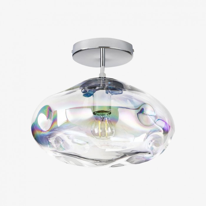 This modern ceiling light features an oval, dented glass shade that shimmers in mirrored or iridescent finishes. Its reflective surface casts a warm, ambient glow, while the semi-flush design with a sleek metal canopy adds contemporary elegance to living rooms, bedrooms, hallways, and entryways.