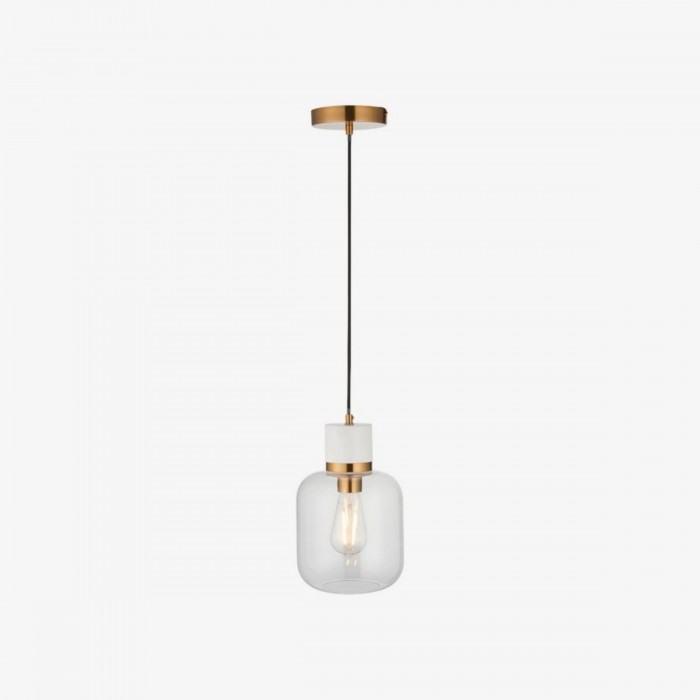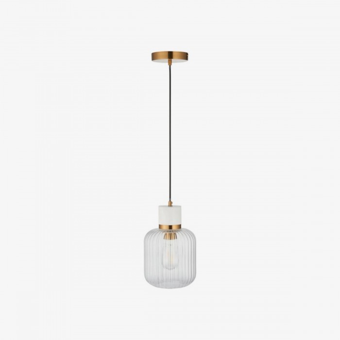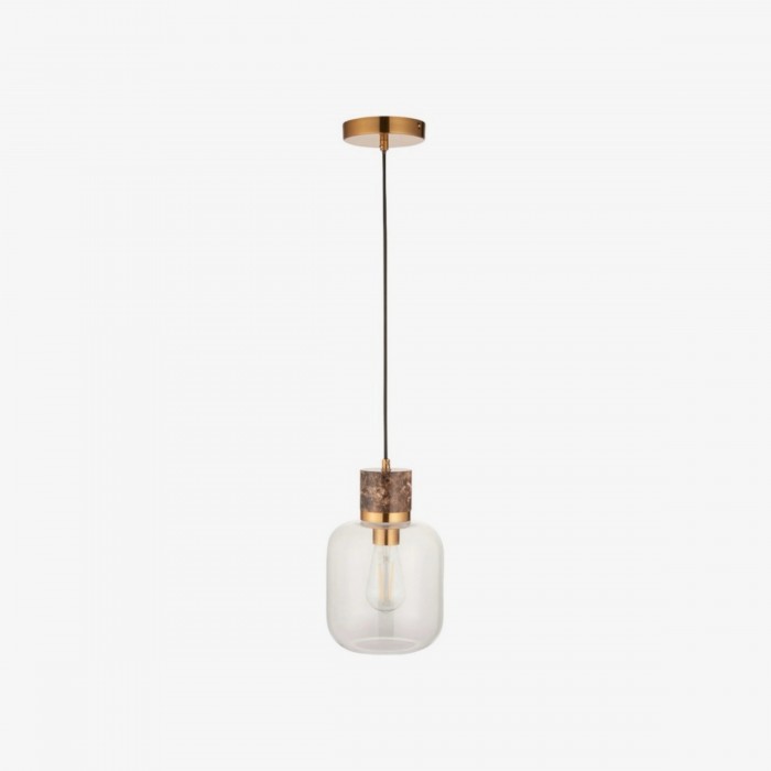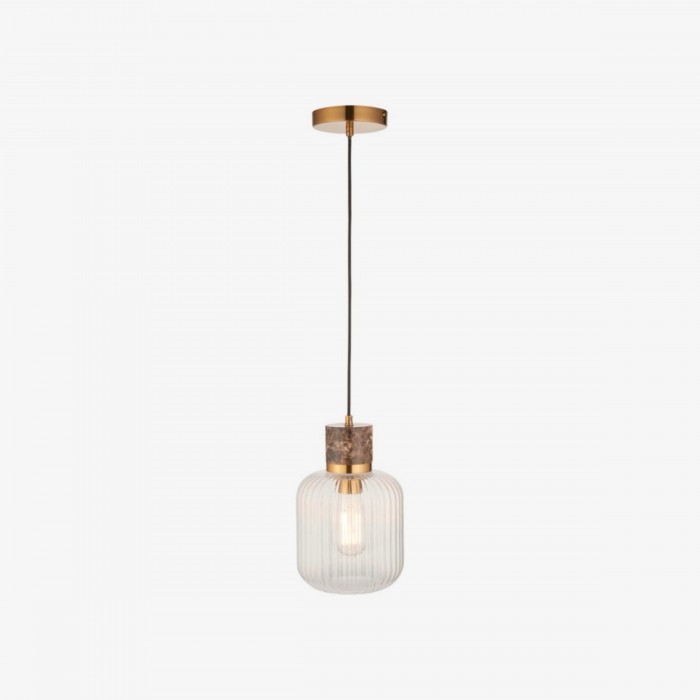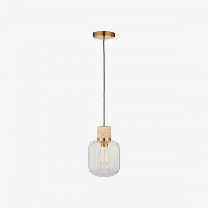 Korlisse pendant lights combine elemental stone with warm brass and softly curved glass. Varieties include travertine, Emperador marble, or Volakas marble, paired with clear or ribbed glass shades. Their elegant, natural-meets-modern design suits kitchens, dining areas, living rooms, or entryways.