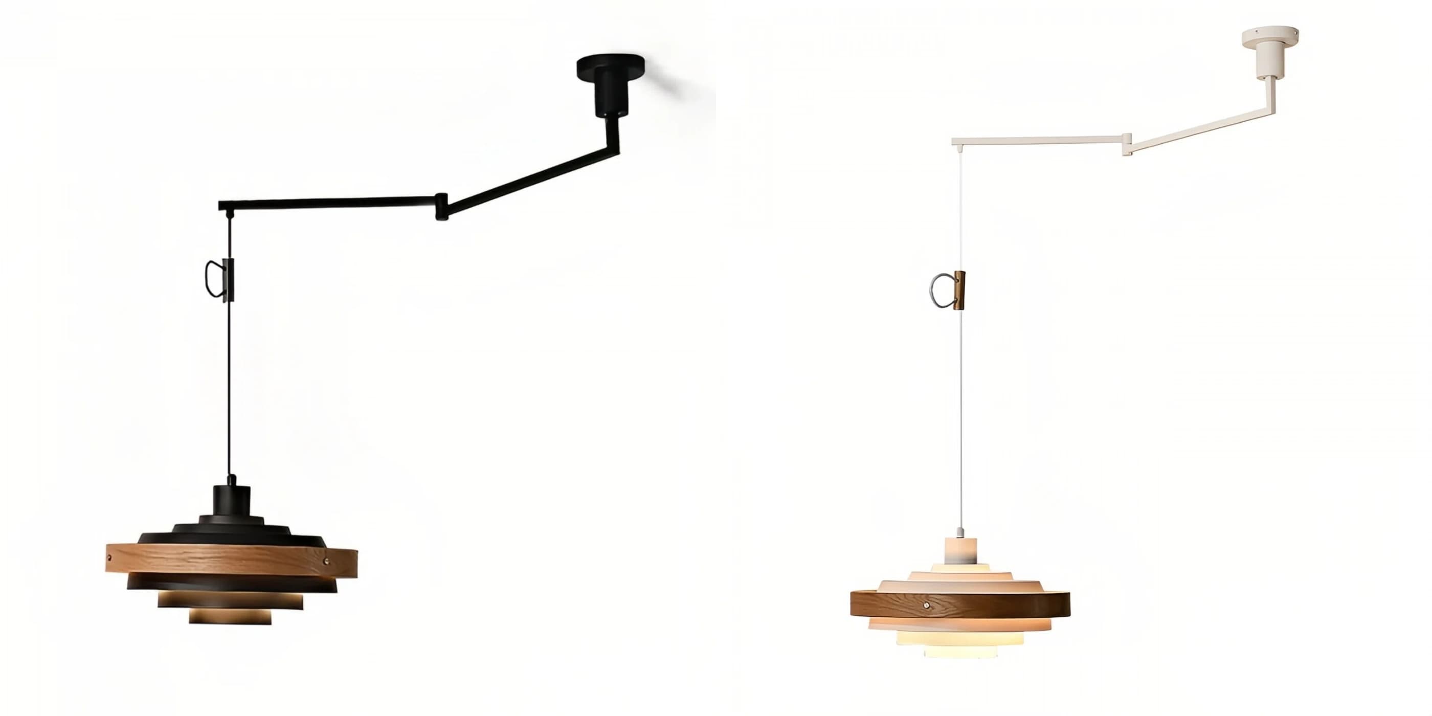 This vintage swing arm pendant light blends industrial function with warm wooden accents. Its adjustable arm lets you direct light as needed, while the layered wood-and-metal shade adds rustic texture. Ideal for dining areas, workspaces, kitchen islands, and cozy indoor corners.