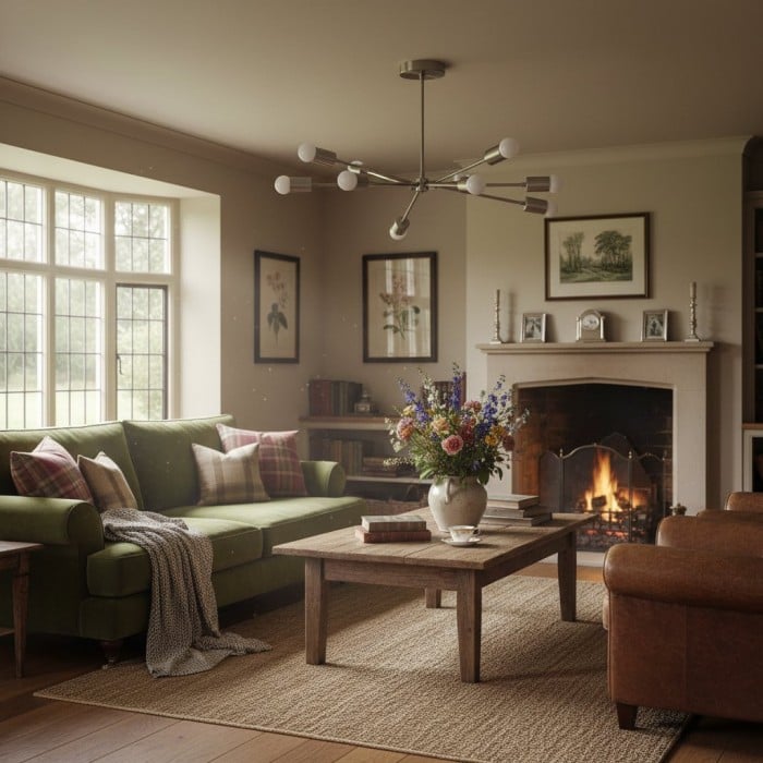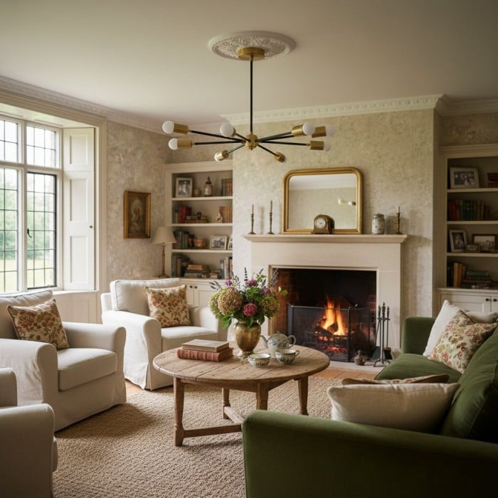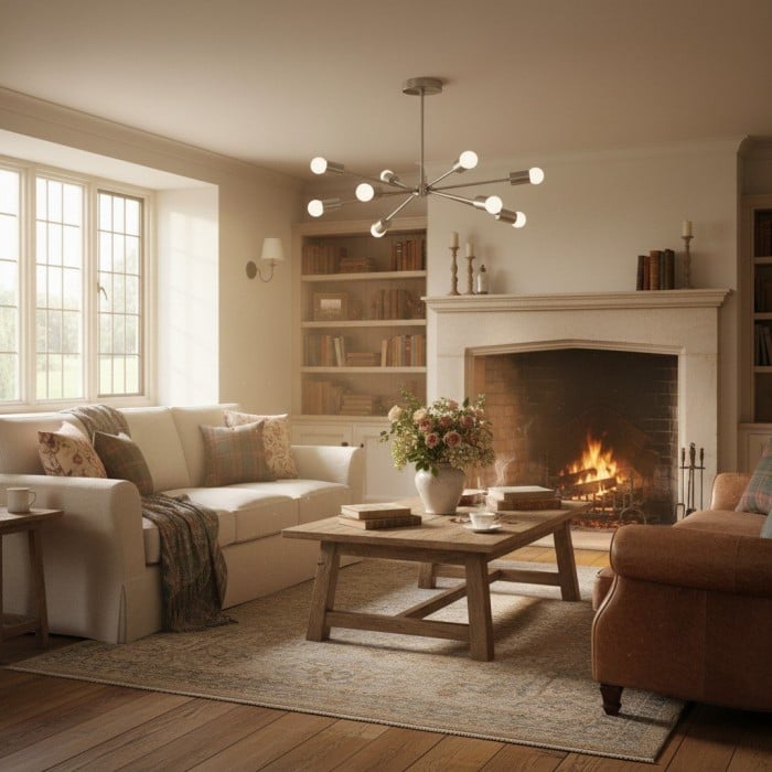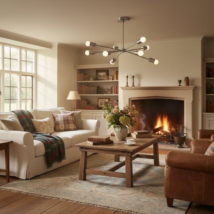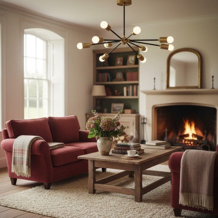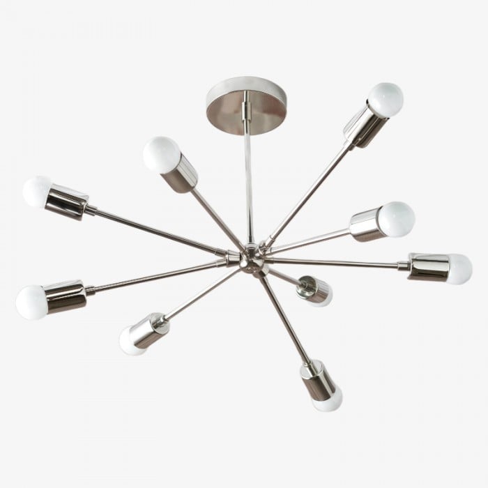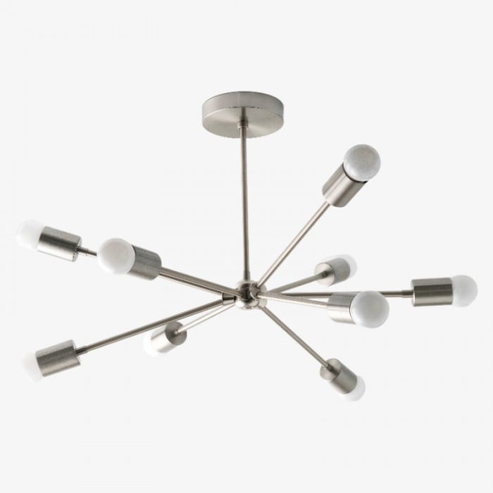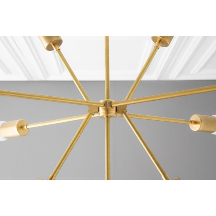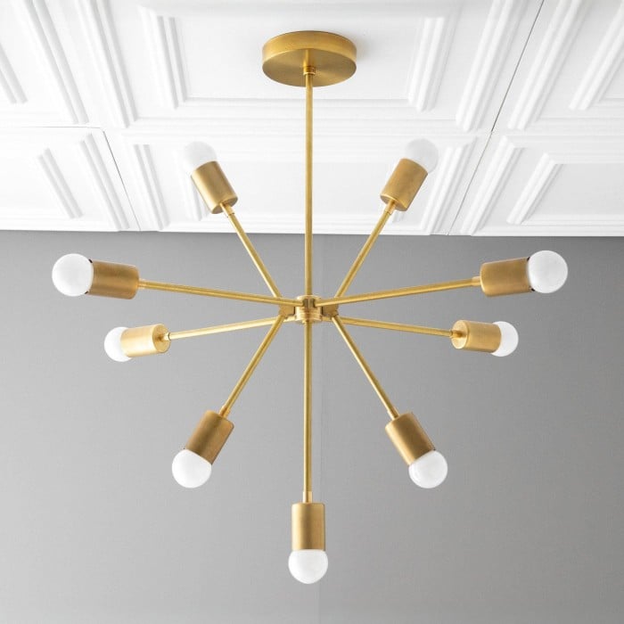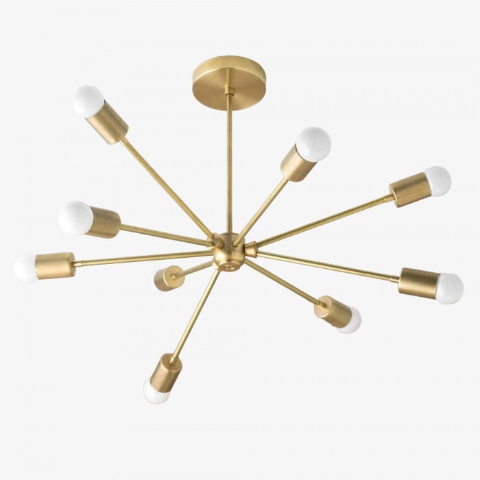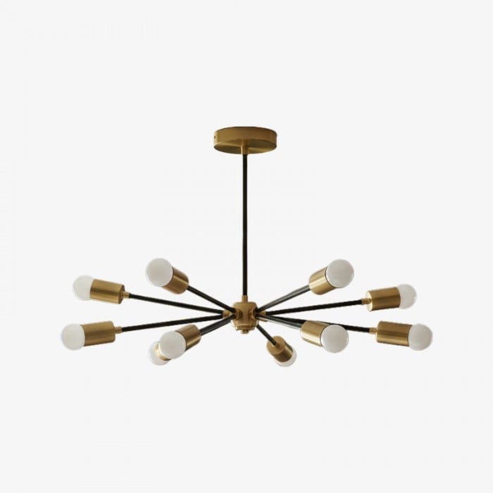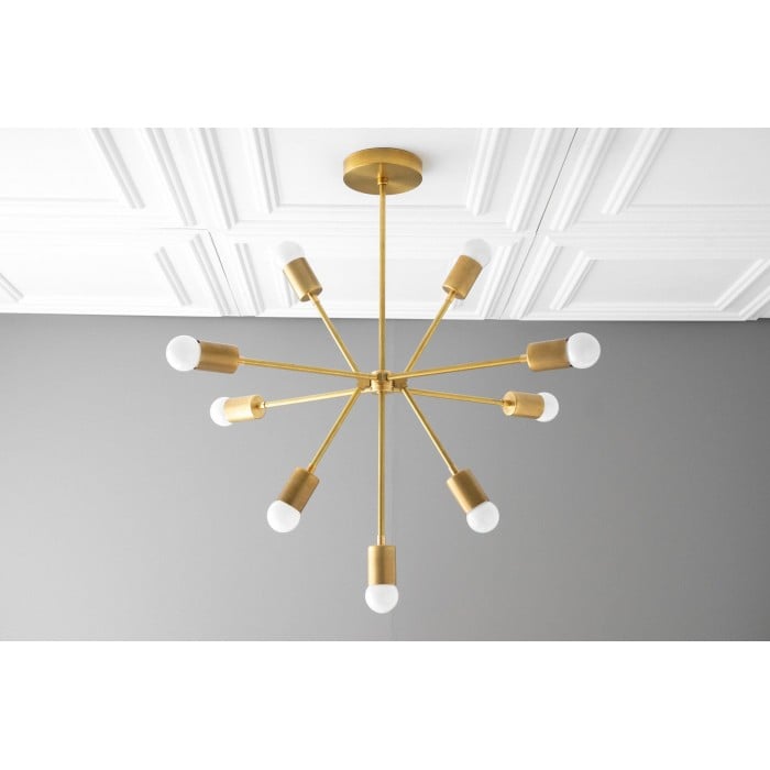 Add a touch of retro-inspired elegance with this contemporary brass chandelier. Its iconic mid-century arm structure spreads light beautifully while the soft brass finish enhances its modern appeal. Perfect for dining areas, living rooms, or entryways, this ceiling light combines style and function.