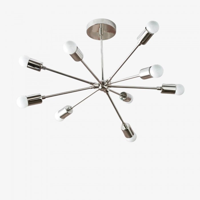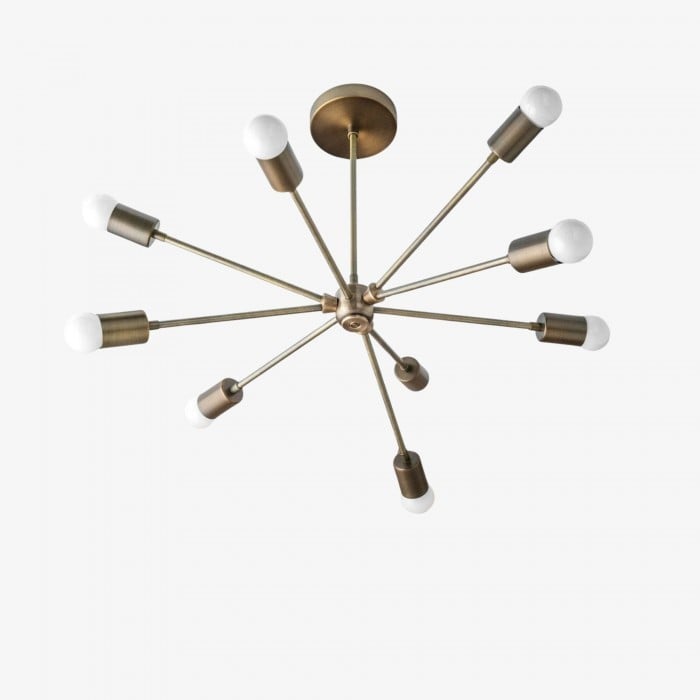 Revive the iconic style of the mid-century era with our stunning Sputnik chandelier. Crafted from solid brass with a character-rich, soft luster finish, this modern ceiling lamp adds a touch of vintage sophistication to any space. Its radiating arms create a captivating geometric silhouette, perfect for living rooms, dining areas, or entryways. This fixture is not too shiny, offering a warm glow that complements contemporary interiors with timeless elegance. Elevate your home decor with this statement piece.