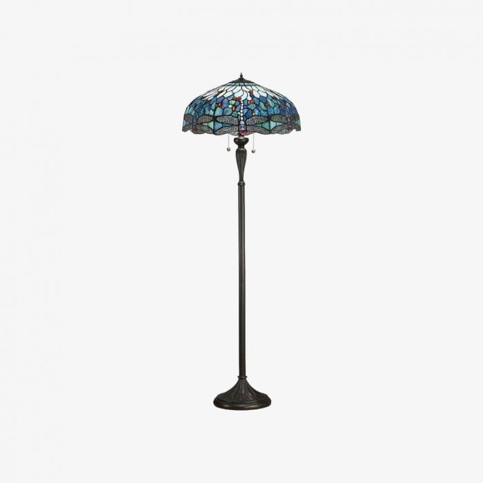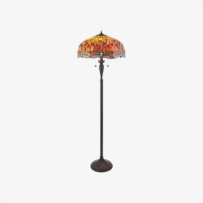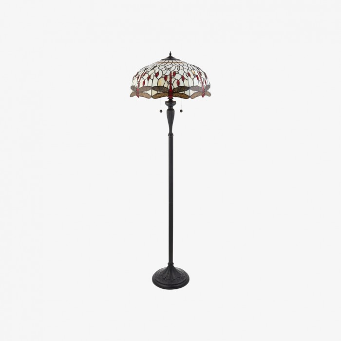 TF Dragonfly floor lamp with a handcrafted stained‑glass mosaic shade featuring dragonfly motifs and jewel-toned panels. Perfect for living rooms, reading corners and bedrooms to provide warm, decorative ambient light.