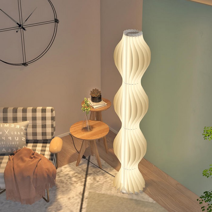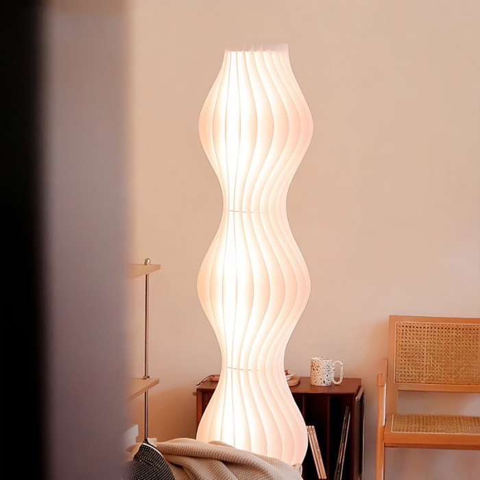 The Vapor floor lamp is a playfully decorative steam floor lamp. The softly undulating lines bring out warm, diffused light, creating natural shadows through the pleated and rippled silhouette. The Vapor floor lamp enhances the interior by instilling a vibrant sense of harmony, a piece that cannot be missing in an environment where you are aiming for a unique design. The material's immensity and robustness make this steam a great companion for living spaces that require comfortable light and a keen sense of design.
