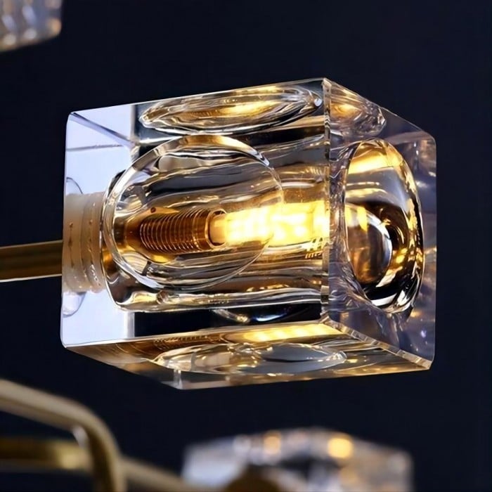 Square crystal chandelier is made of solid brass and crystal glass and shows the enthusiasm of luxurious materials and craftsmanship. Evoking the minimalist spirit of 1960s design, each finely carved surface has been hand buffed and buffed to reflect and refract light.