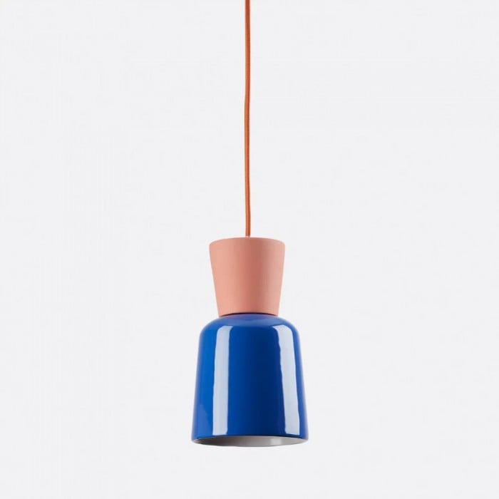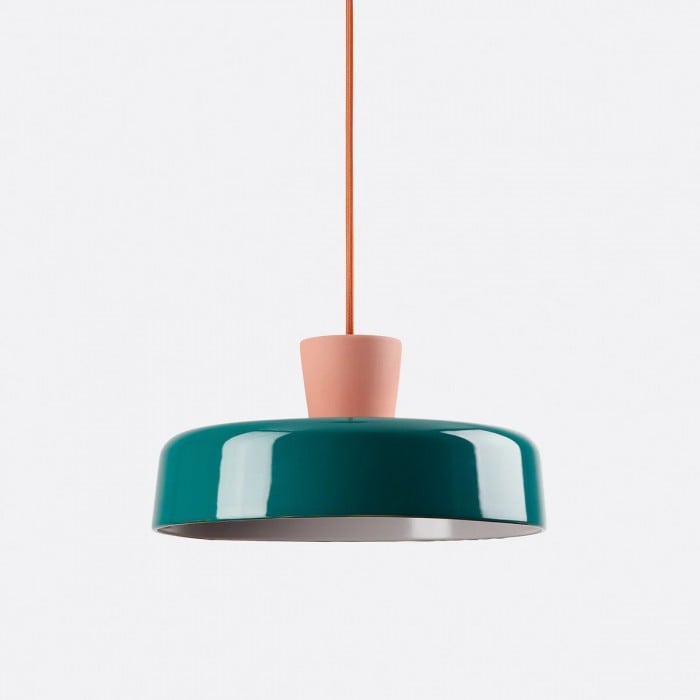 Lámpara colgante colorida de inspiración retro con pantalla lisa en forma de cuenco y un llamativo acabado bicolor. Fabricada con materiales resistentes y disponible en varios tamaños, es perfecta para cualquier espacio.