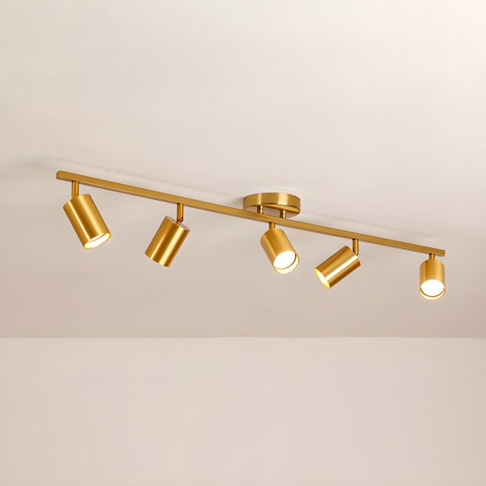 La lámpara de techo combina elegantes detalles dorados con cabezales de foco ajustables, lo que ofrece elegancia y funcionalidad. Perfecta para espacios habitables o galerías, le permite crear efectos de iluminación dinámicos a la vez que realza su decoración. Garantizamos un diseño y un rendimiento impecables.