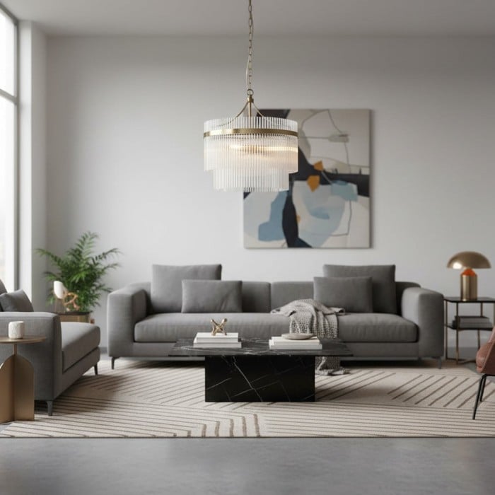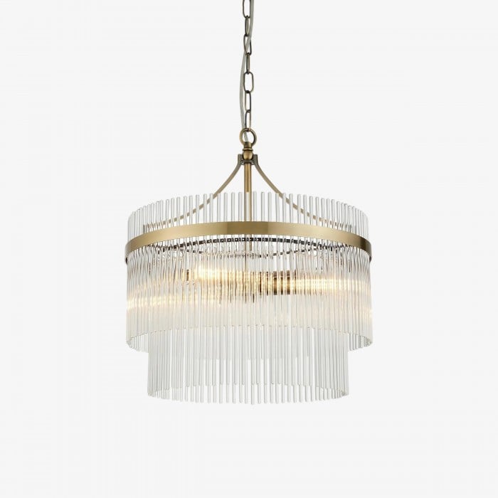 Presentamos nuestra elegante lámpara colgante de 3 luces con varillas de vidrio y acabado en latón vintage, una fusión impactante de diseño contemporáneo y elegancia atemporal. Esta lámpara colgante presenta un acabado en latón antiguo que irradia un cálido encanto vintage. Las varillas decorativas de vidrio transparente son el punto culminante de esta pieza, difundiendo la luz con gran belleza para crear un ambiente suave, acogedor y romántico en cualquier espacio.