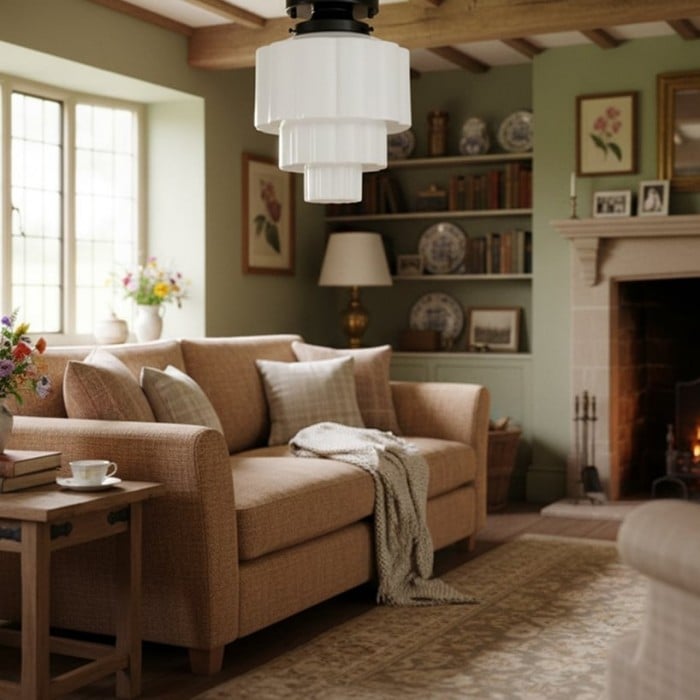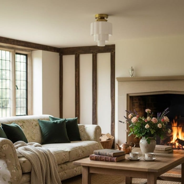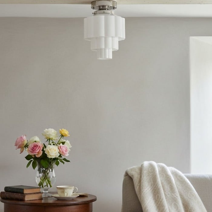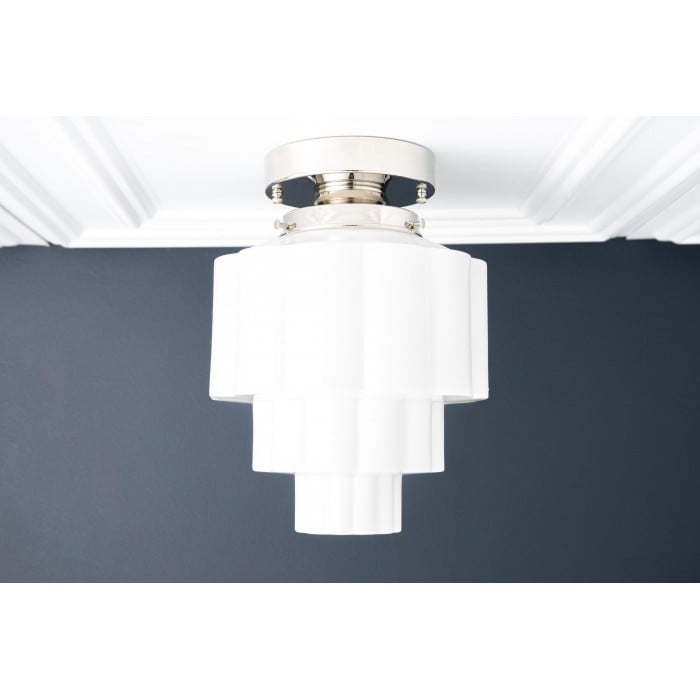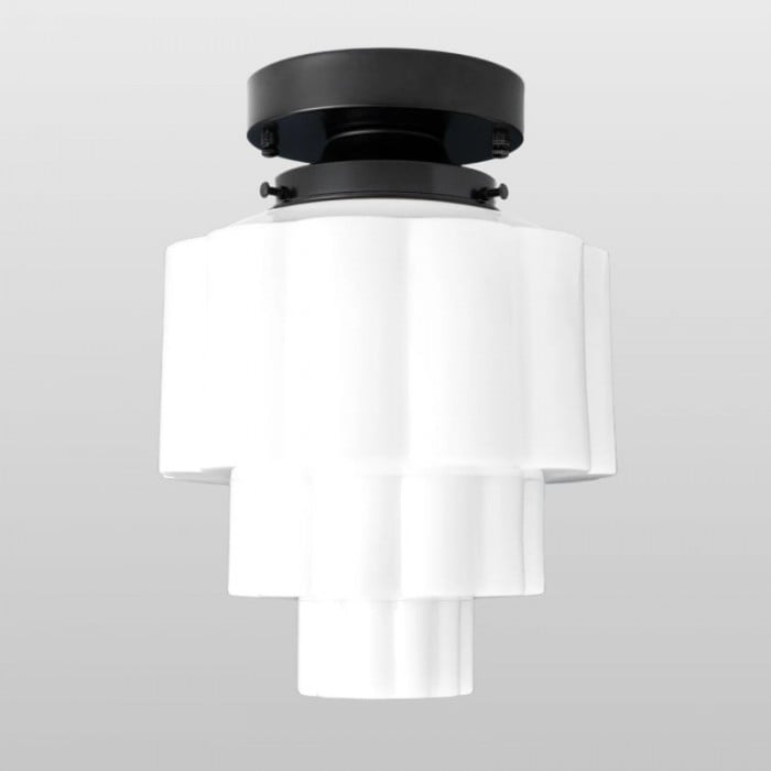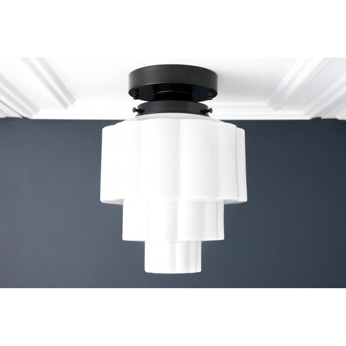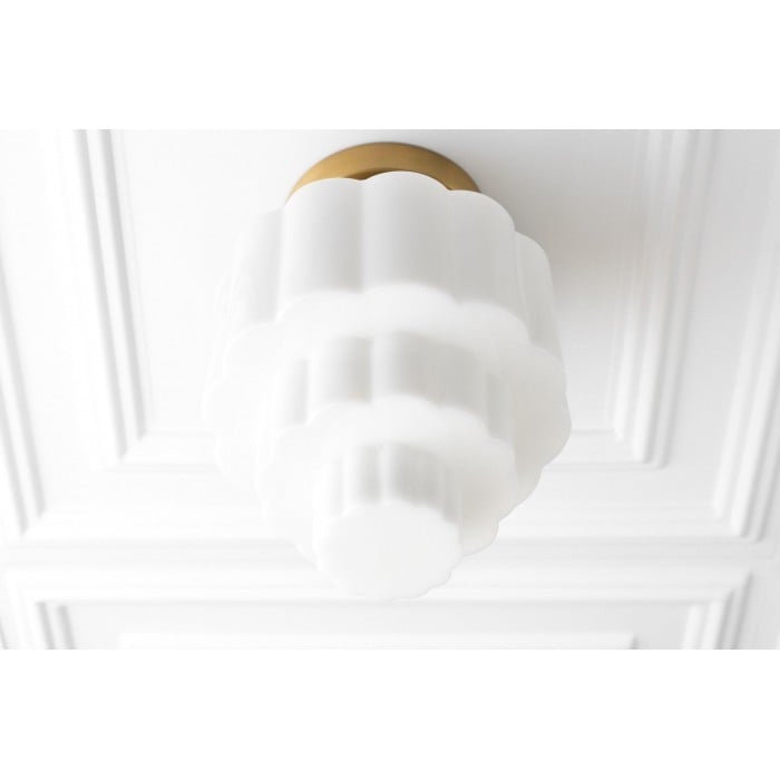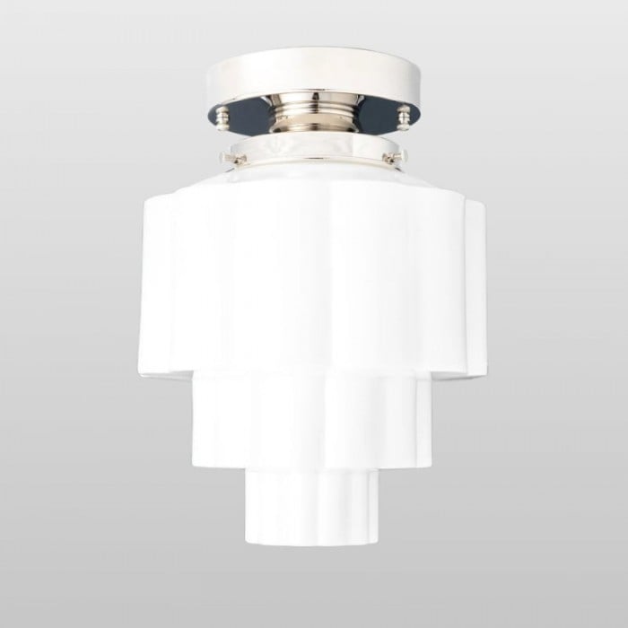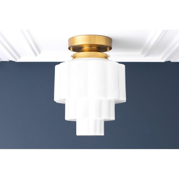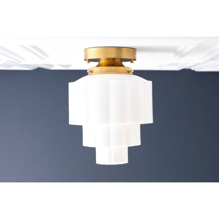 La lámpara de techo Geotower Glass presenta un globo de ópalo acanalado Art Déco con una luminaria de latón. Su silueta escalonada le aporta un carácter vintage, mientras que sus refinados acabados aportan una sofisticación atemporal tanto a interiores modernos como tradicionales.