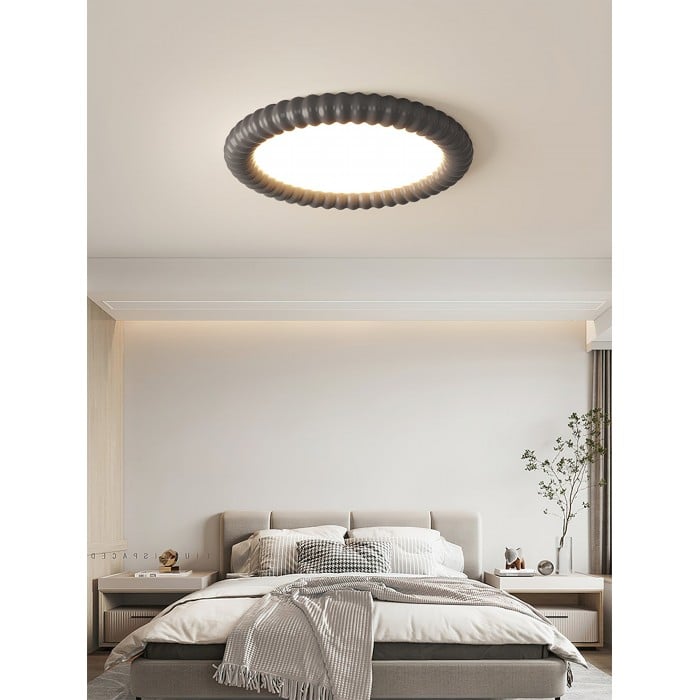 La lámpara de techo con forma de anillo ondulado en color crema se inspira en las suaves ondulaciones del agua, capturadas en una forma circular que emite un brillo suave y difuso. La textura acanalada a lo largo del perímetro evoca la imagen de un estanque sereno con ondas que se extienden hacia afuera, simbolizando tranquilidad y armonía.