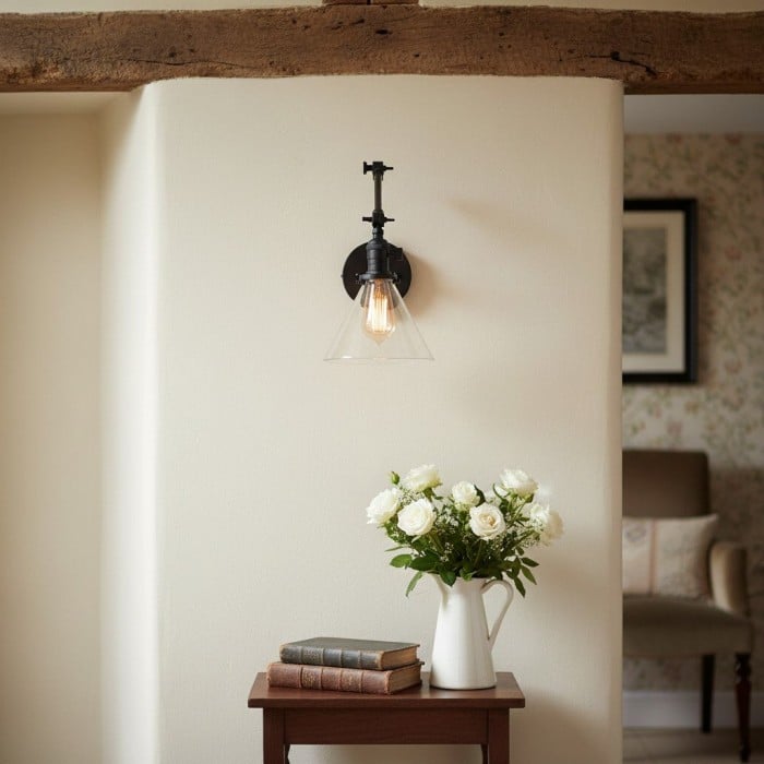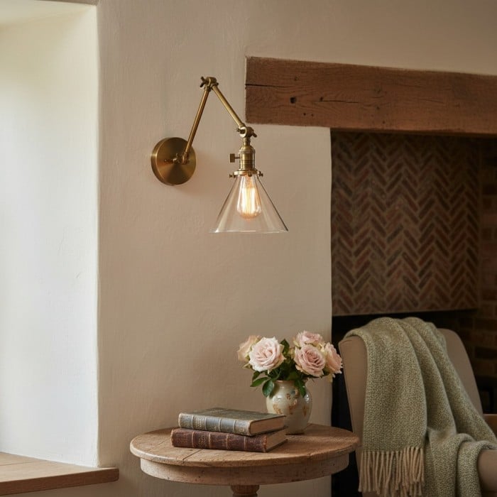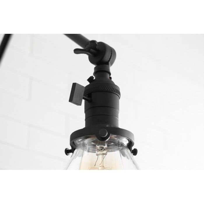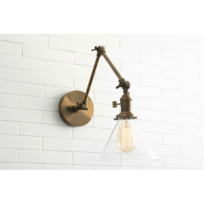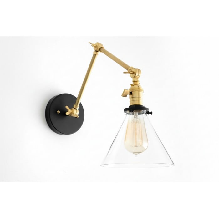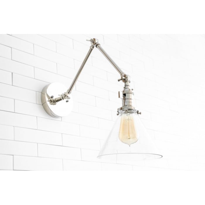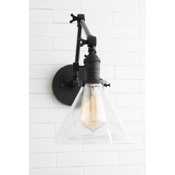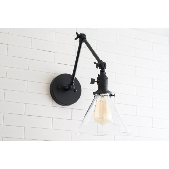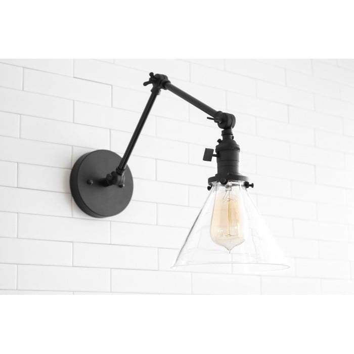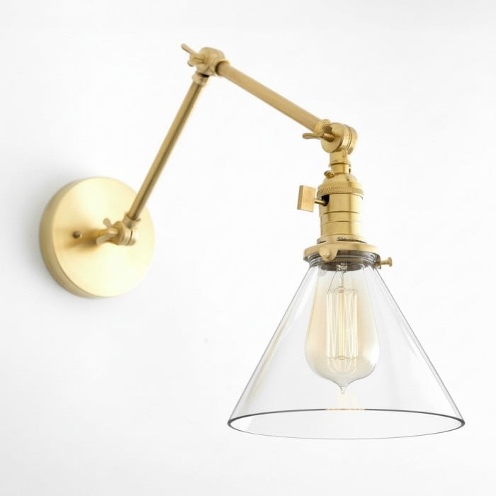 Esta lámpara de pared industrial cuenta con un brazo metálico totalmente ajustable con articulaciones giratorias para una iluminación precisa. La pantalla cónica de vidrio transparente ofrece una visibilidad nítida, complementando su diseño de inspiración vintage. Perfecta para rincones de lectura, estudios y cafeterías que buscan un toque de encanto industrial.
