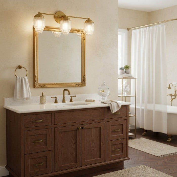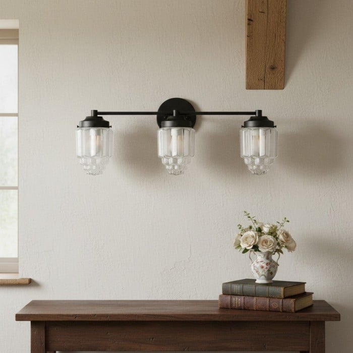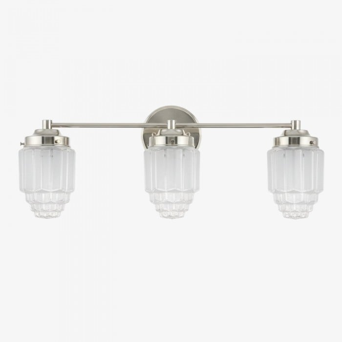 La lámpara de tocador Tierlux Glass aporta elegancia Art Déco a su baño con tres opciones de tamaño: cabezal simple, doble o triple. Cada lámpara cuenta con pantallas de vidrio inspiradas en rascacielos con detalles esmerilados, ofreciendo un diseño atemporal y una iluminación equilibrada. Perfecta para espejos o tocadores, aporta sofisticación y funcionalidad.