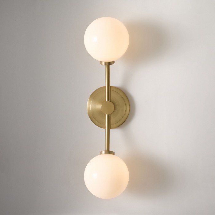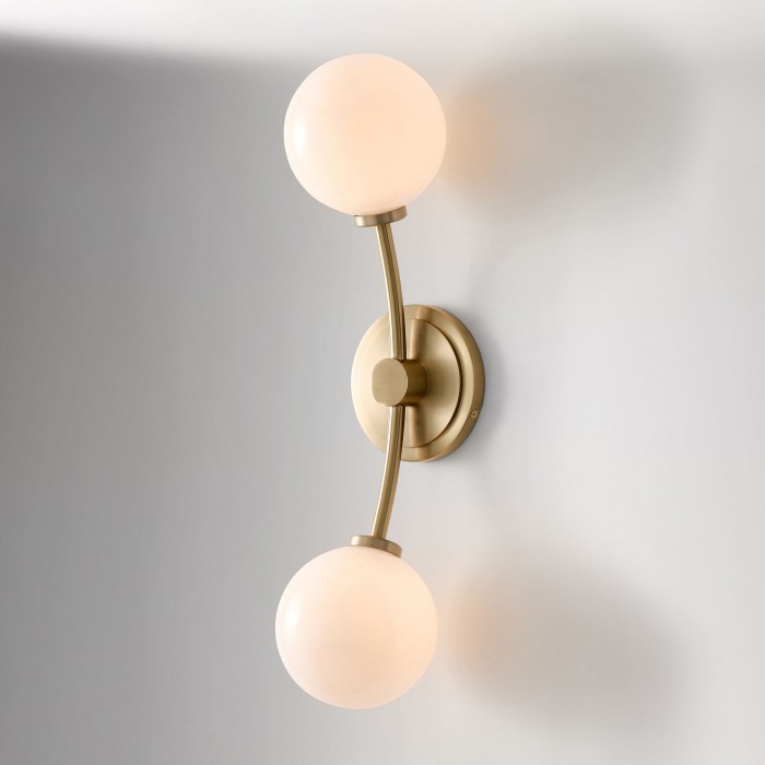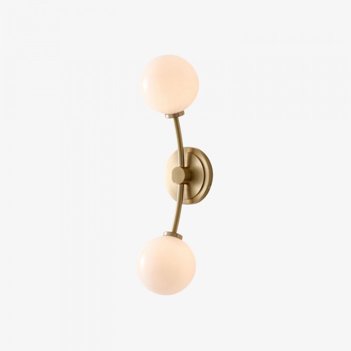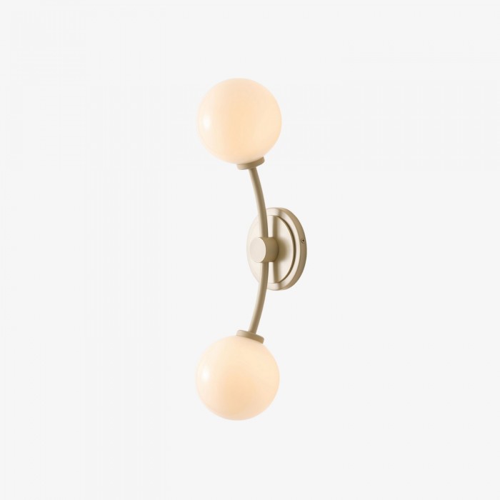L'applique murale Arden Glass allie l'élégance sculpturale à la simplicité moderne : deux globes en verre opalin dépoli reposent avec grâce sur un bras en fer légèrement incurvé, créant un éclairage doux et ambiant.