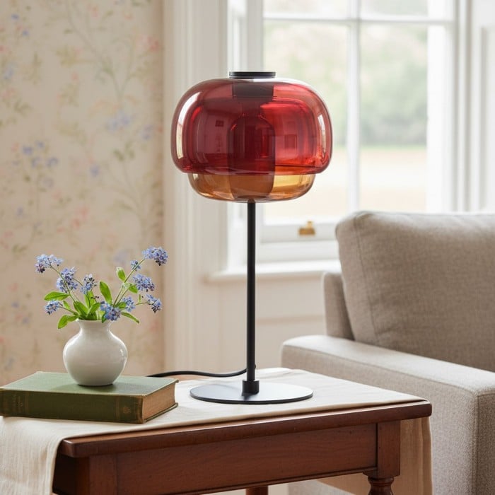 La lampe de table en verre coloré met en valeur un savoir-faire exquis avec son abat-jour en verre soufflé à la main. Son design bicolore unique diffuse une lumière chaleureuse et ambiante. Cette lampe de table rétro allie charme du milieu du siècle et élégance contemporaine, idéale pour un salon ou une chambre. Chaque abat-jour en verre bicolore est fabriqué individuellement, offrant de subtiles variations qui soulignent son caractère artisanal.