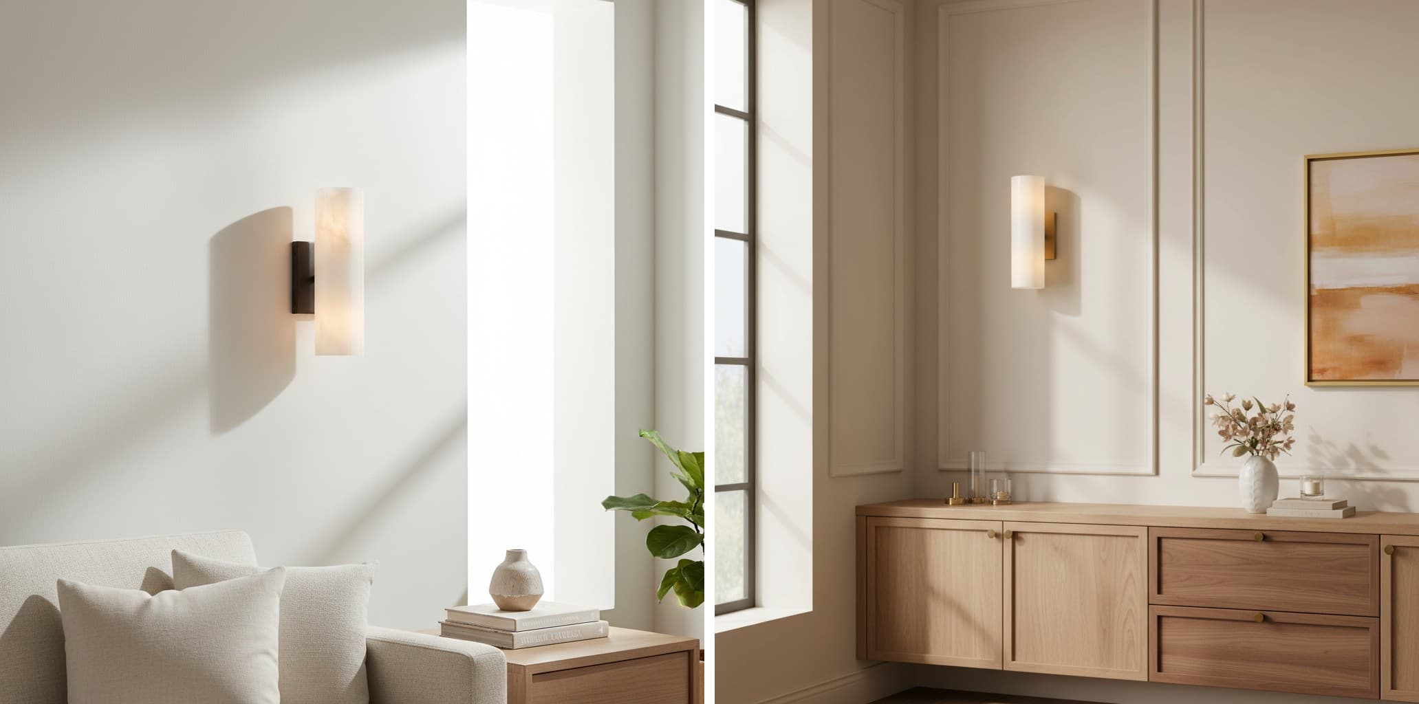 Cette élégante applique murale est composée d'un tube cylindrique en albâtre aux veinures uniques, enchâssé dans une structure métallique minimaliste. Elle diffuse une douce lumière chaude qui se répand délicatement à travers l'albâtre, idéale pour les couloirs, les chambres, les salles d'eau ou comme éclairage d'ambiance moderne.