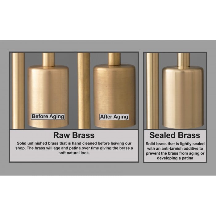 - Notre finition laiton brut est réalisée en laiton massif brut, nettoyé à la main avant de quitter notre atelier. Avec le temps, le laiton vieillira et se patinera, lui conférant un aspect naturel et doux. Veuillez porter des gants lors de l'installation de tous les luminaires. Le toucher à mains nues risque de ternir le laiton brut.