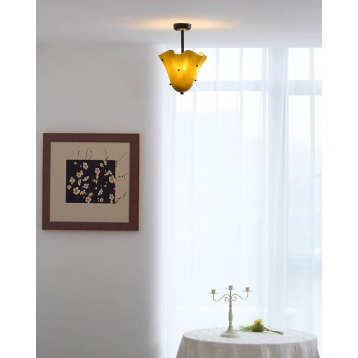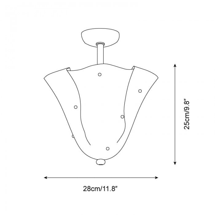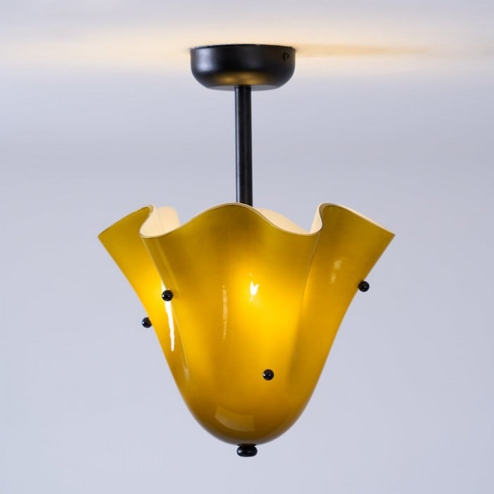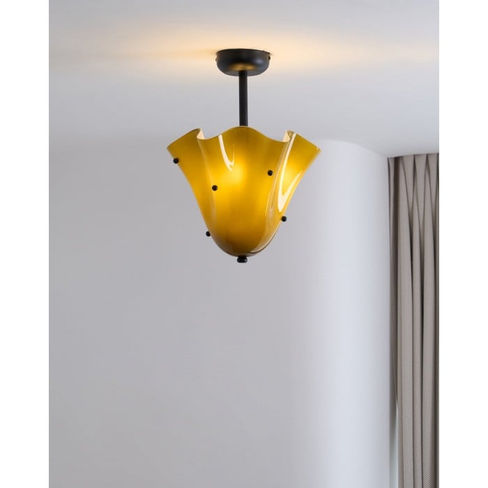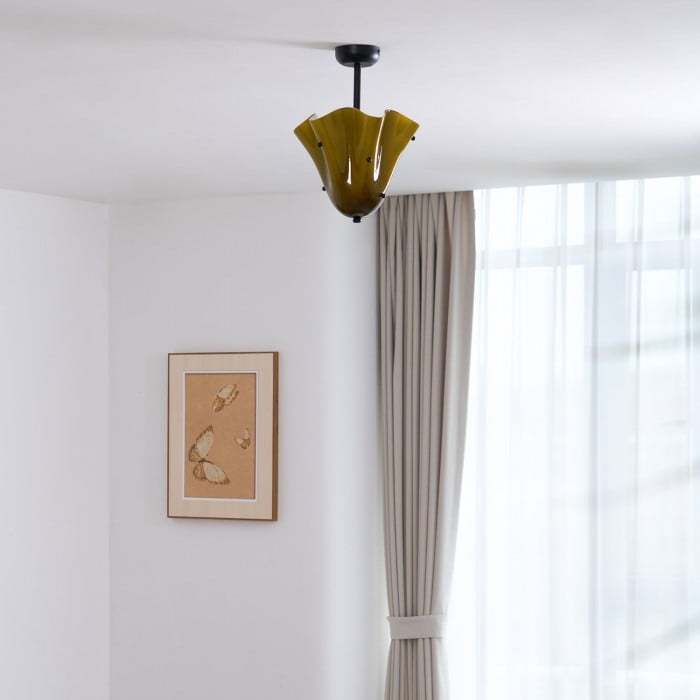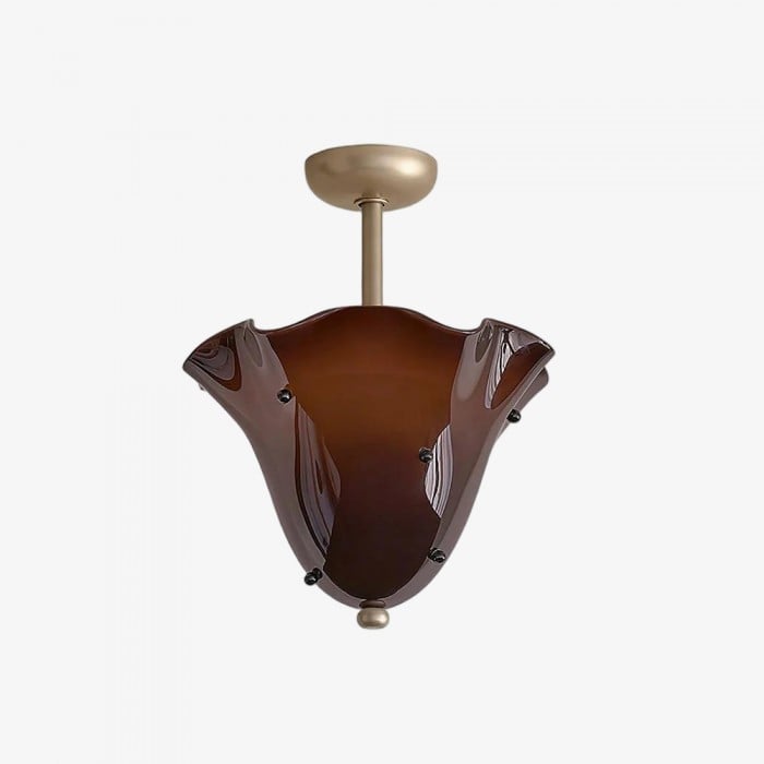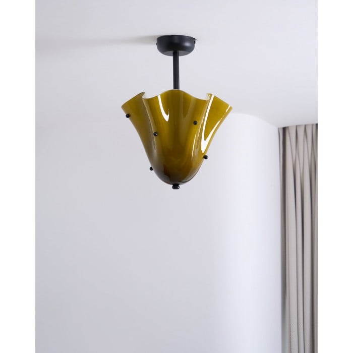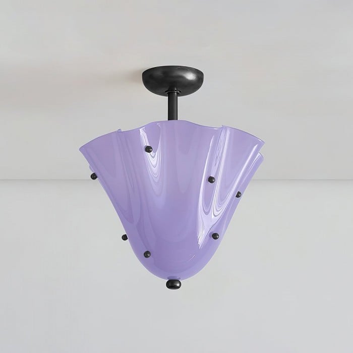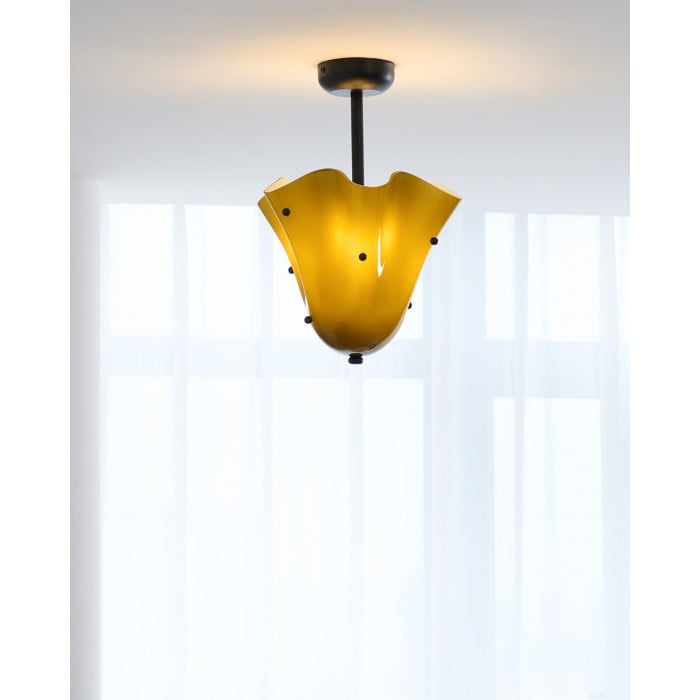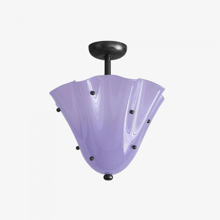 Sculptural et contemporain, ce plafonnier est composé de verre façonné à la main, aux plis délicats rappelant des pétales et orné de délicats clous décoratifs. Suspendu à un élégant dais en métal, il crée un point focal artistique tout en diffusant une lumière chaleureuse. Idéal pour les chambres, les salles à manger ou les salles de bains avec une touche moderne.
