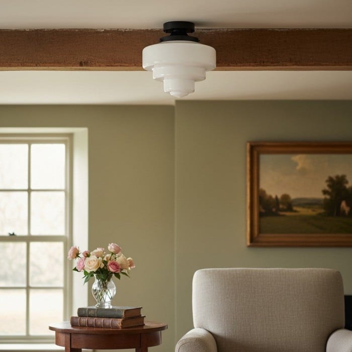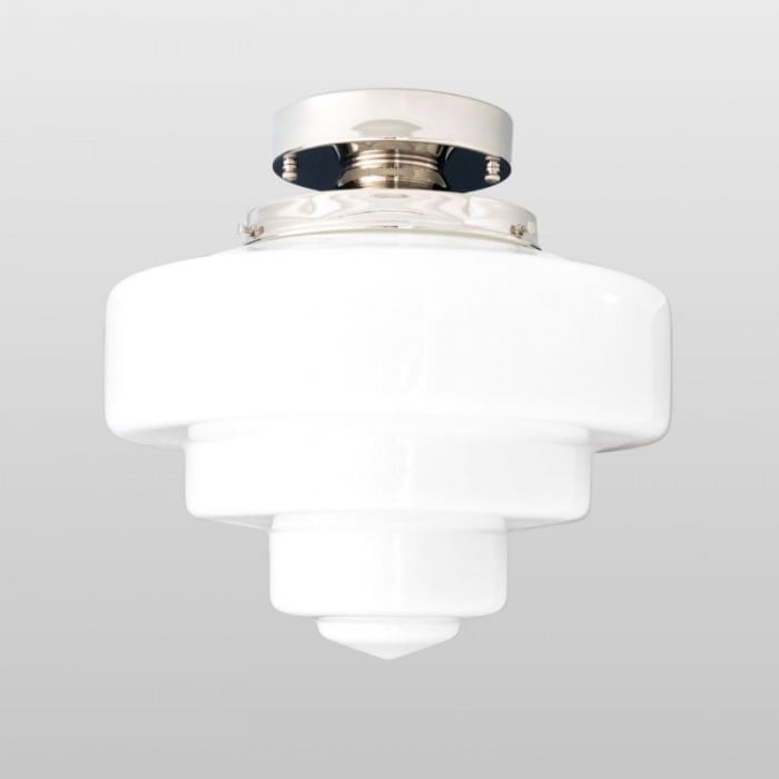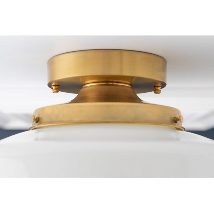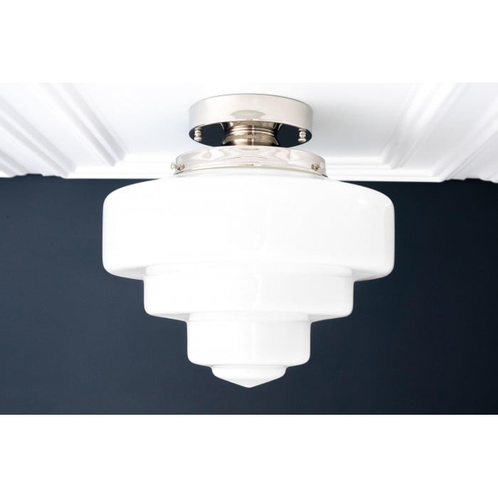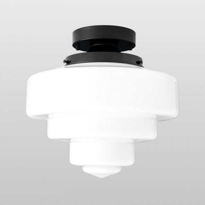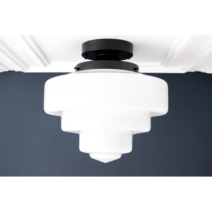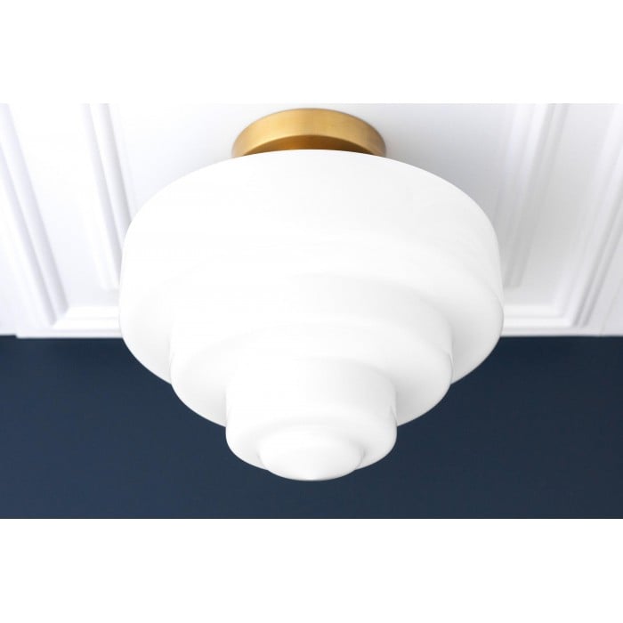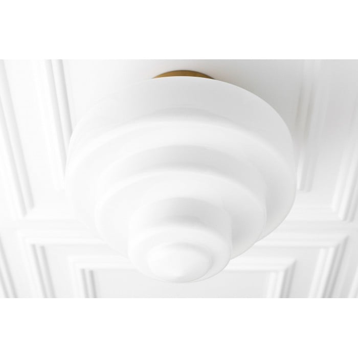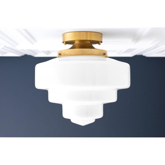 Le plafonnier Geotower Glass allie le savoir-faire du laiton à un globe lumineux en verre opale. Inspiré de l'esthétique Art déco, il crée une ambiance douce et élégante dans tous les espaces.