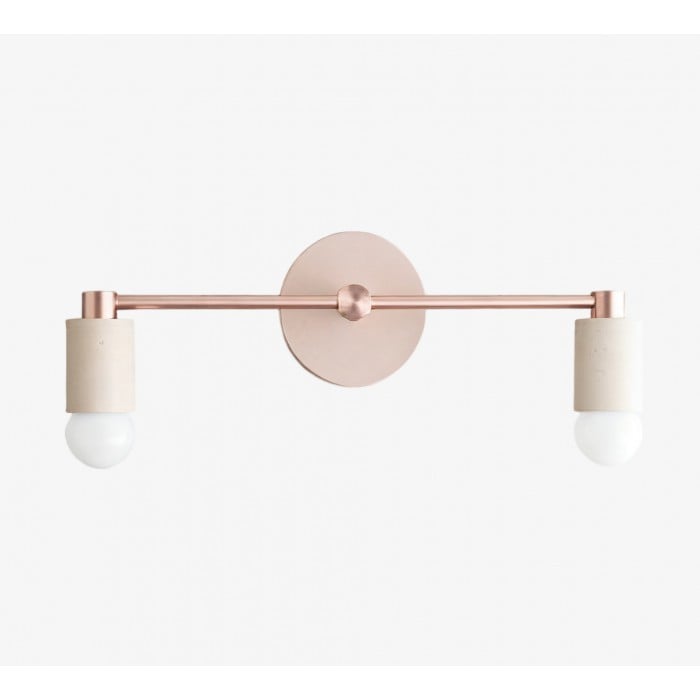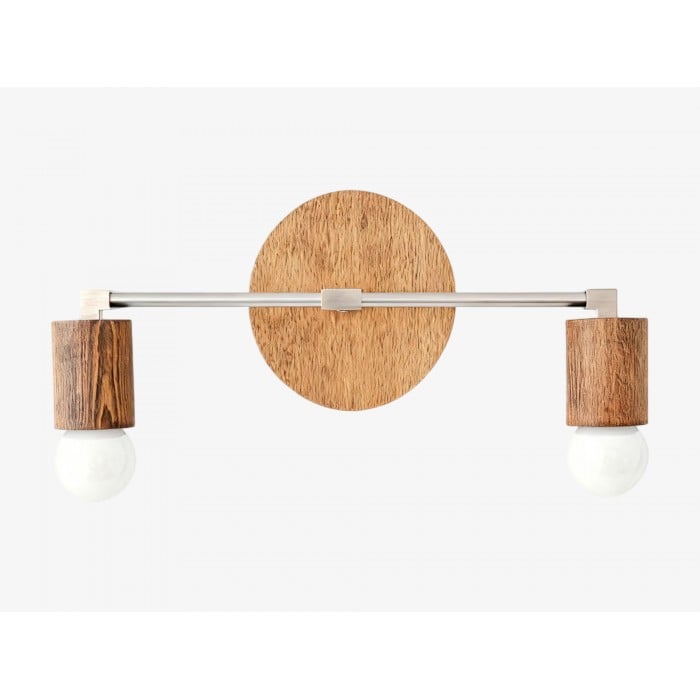 Celebra il fascino rustico-industriale. Questa esclusiva lampada da toeletta combina una finitura in legno di rovere massello con una selezione di dettagli in metallo di alta qualità, dall'ottone grezzo al nichel lucido. Questo pezzo d'arredo crea un punto focale accogliente e artistico in qualsiasi bagno. Completamente testato e certificato UL.