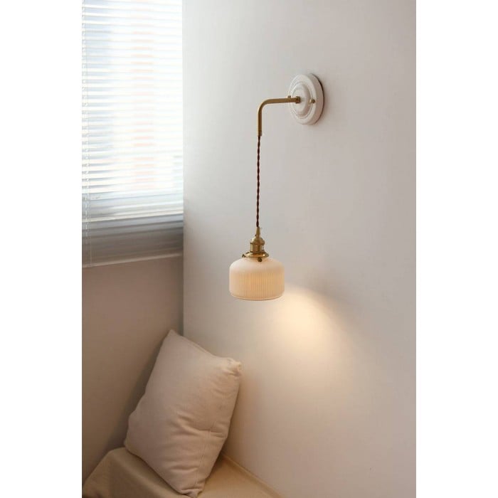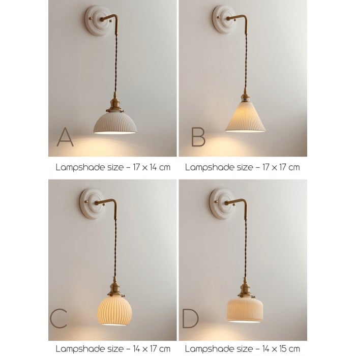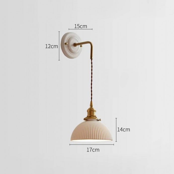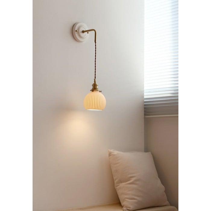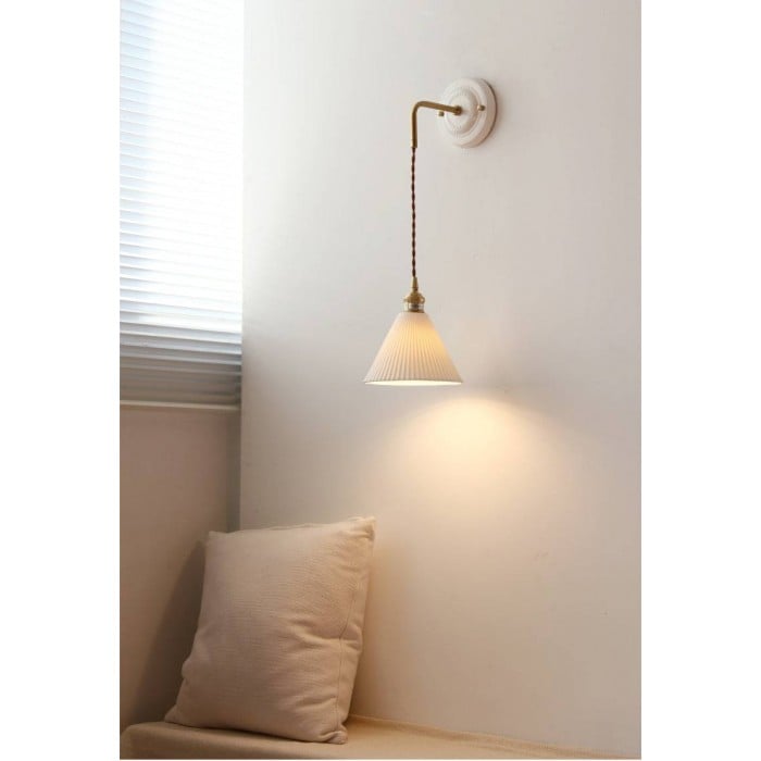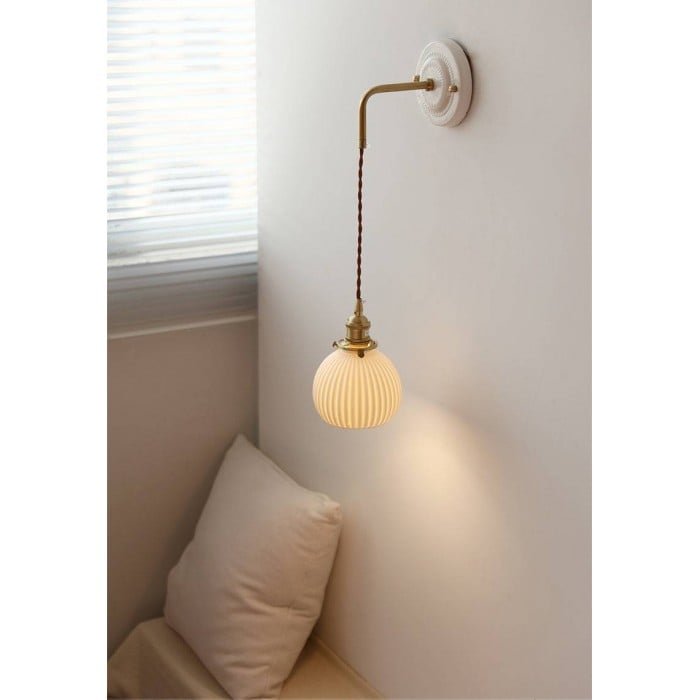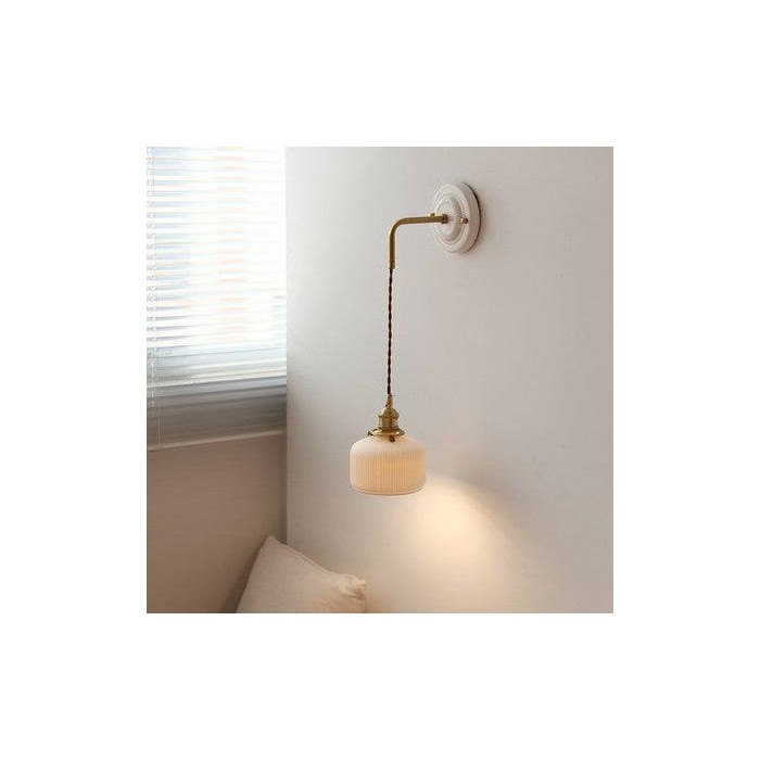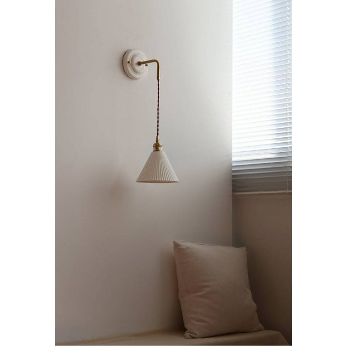 Applique decorativa con paralume in ceramica e piastra a muro. La lampada può essere personalizzata con attacco a spina o a catenella. Il colore bianco neutro si adatta a qualsiasi ambiente. La finitura in ottone aggiungerà stile a qualsiasi arredamento moderno.