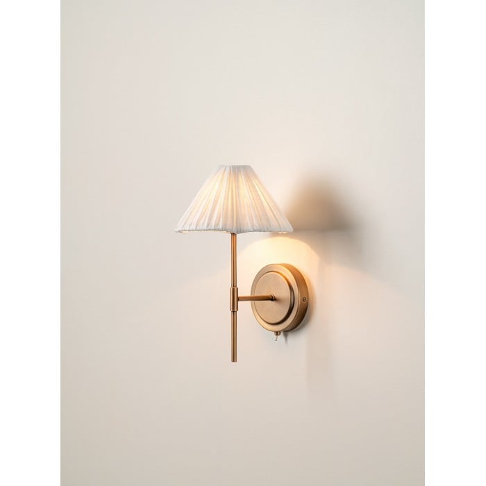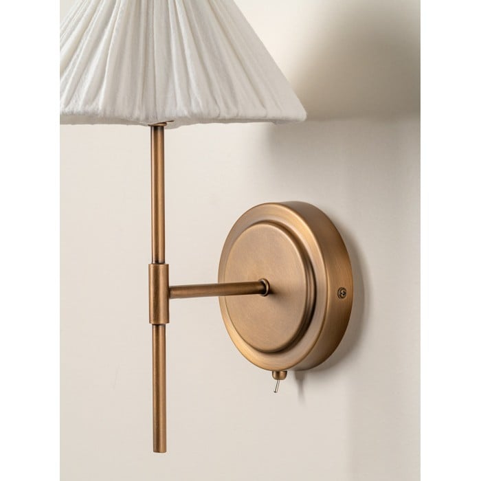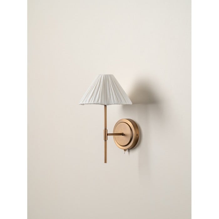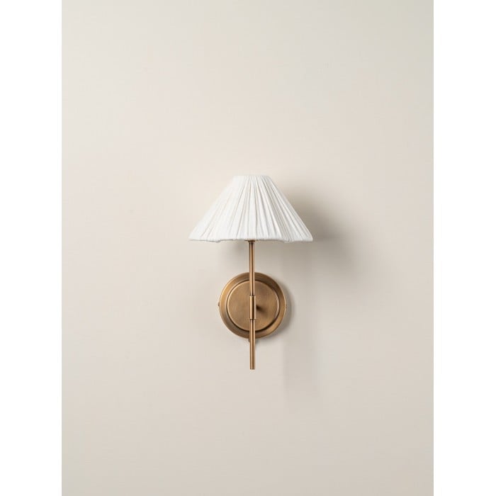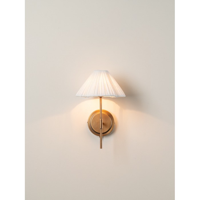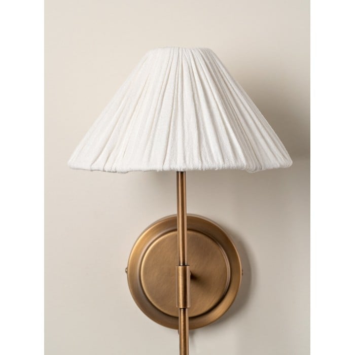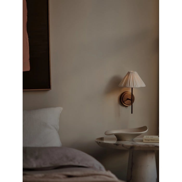 Lindi è un'elegante lampada da parete, progettata ispirandosi a forme e texture floreali. Morbide pieghe scendono lungo una struttura smerlata per incontrare un raffinato stelo e una piastra a muro in ottone anticato. Il leggero tessuto di lino lascia filtrare delicatamente la luce, creando un'atmosfera morbida e sognante per i vostri interni. Perfetta accanto al letto.
