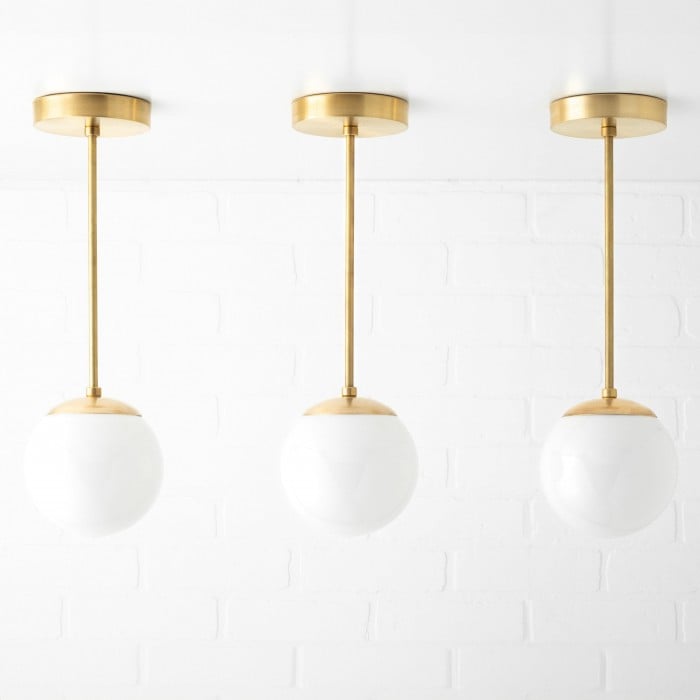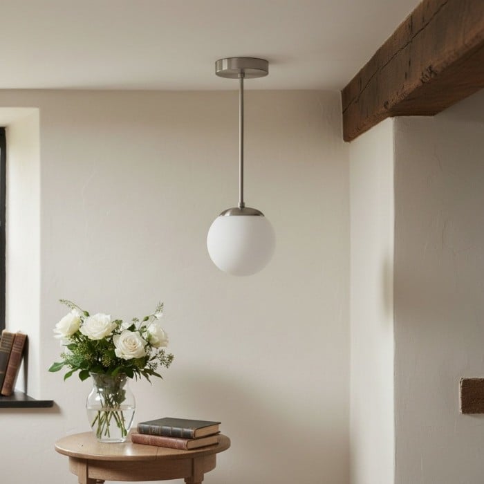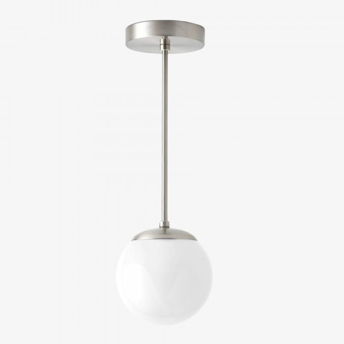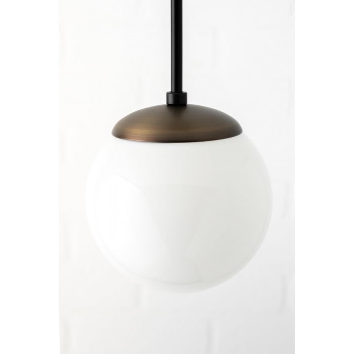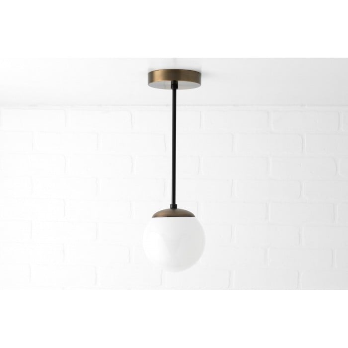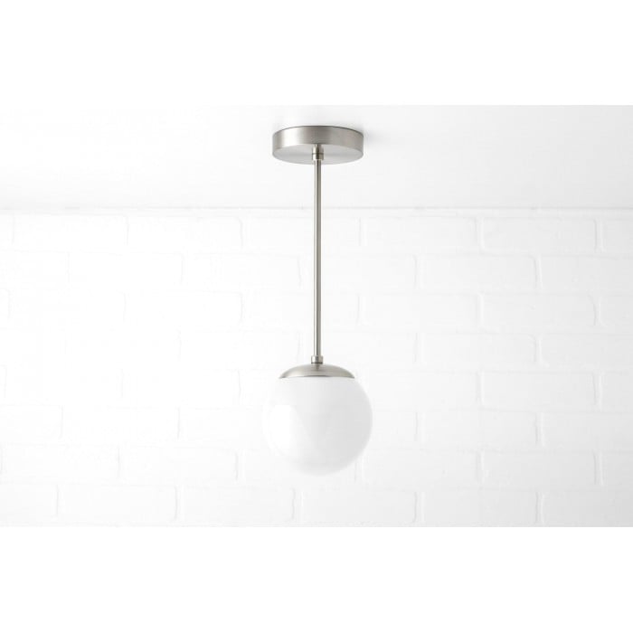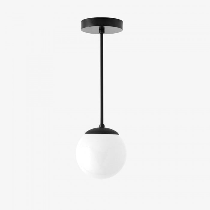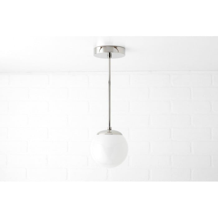 Una classica lampada a sospensione di metà secolo con un globo in vetro bianco lucido. Il suo design a globo senza collo crea un look pulito e raffinato che valorizza gli interni moderni. Perfetta per sale da pranzo, isole in cucina o piccoli spazi, offre eleganza e un'illuminazione morbida e diffusa.