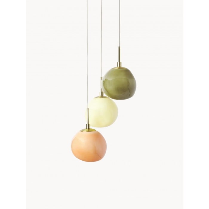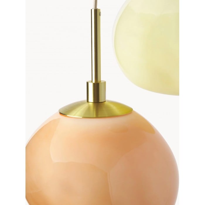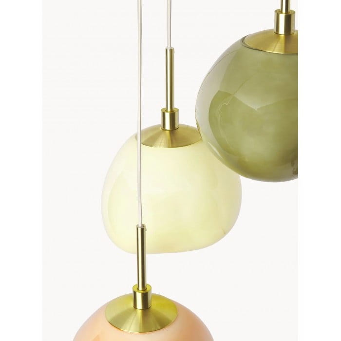 Esalta lo stile della tua casa con la lampada a sospensione multi-paralume in vetro opalino, una lampada a sospensione a grappolo che combina tonalità pastello con dettagli dorati per un look chic e moderno. La lampada è dotata di paralumi in vetro opalino bianco crema, verde chiaro e albicocca che emettono una luce morbida e piacevole, perfetta per creare un ambiente accogliente e invitante.