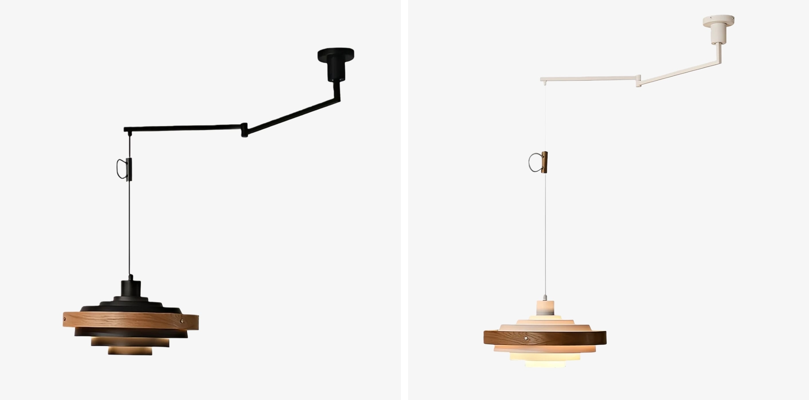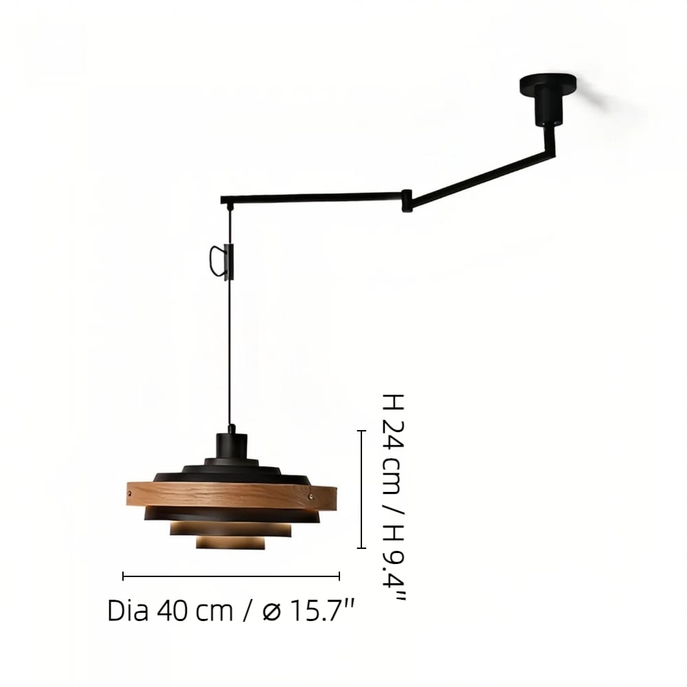 Questa lampada a sospensione vintage con braccio oscillante fonde la funzionalità industriale con caldi accenti in legno. Il suo braccio regolabile consente di orientare la luce secondo necessità, mentre il paralume in legno e metallo a strati aggiunge un tocco rustico. Ideale per sale da pranzo, spazi di lavoro, isole in cucina e accoglienti angoli interni.