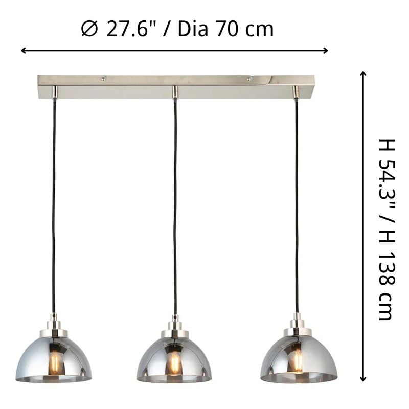 Valorizza sale da pranzo, cucine e soggiorni moderni con la lampada a sospensione Shimmera a 3 luci. Questa lampada a sospensione lineare offre una silhouette elegante e contemporanea, impreziosita da una finitura in nichel lucido e paralumi in vetro specchiato che riflettono la luce in punti luce nitidi e invitanti.