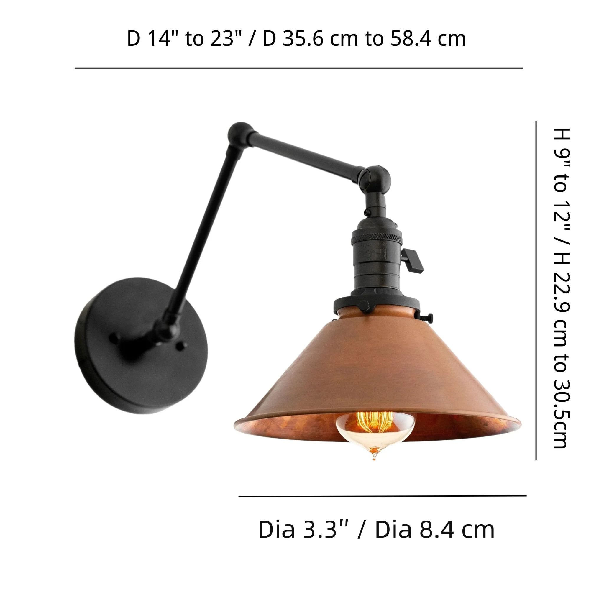 Applique da parete industriale in metallo Conique con braccio regolabile - Paralume conico in rame vintage per illuminazione da