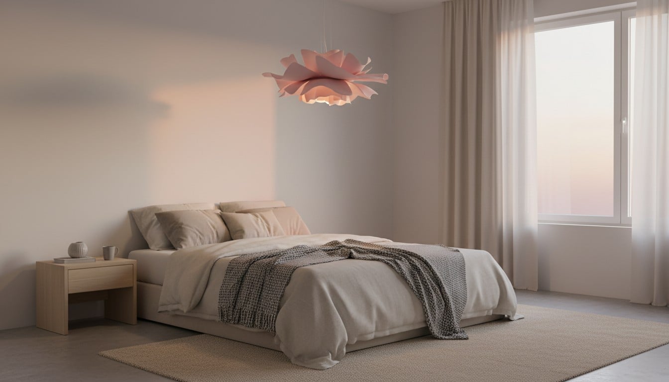Sypialnie często potrzebują oświetlenia, które przede wszystkim uspokaja, a dopiero potem jest praktyczne. Lampa wisząca w kształcie kwiatu może złagodzić wygląd całego pomieszczenia, zwłaszcza gdy meble są proste, a paleta barw neutralna. To prosty sposób, aby sufit wydawał się celowy, a nie zapomniany.
