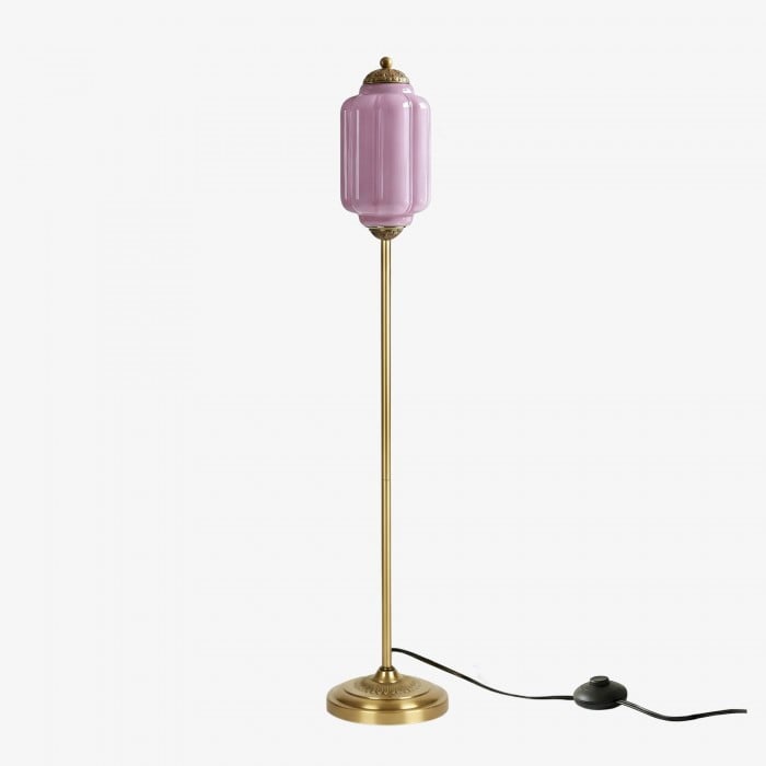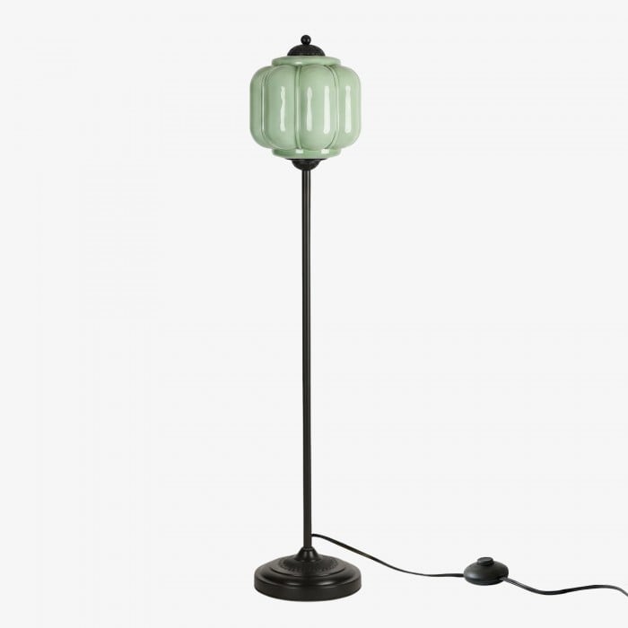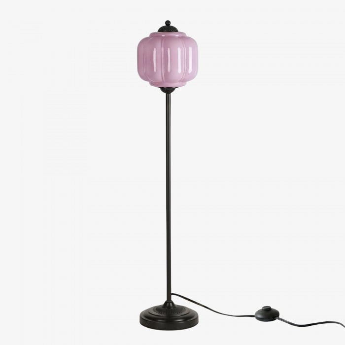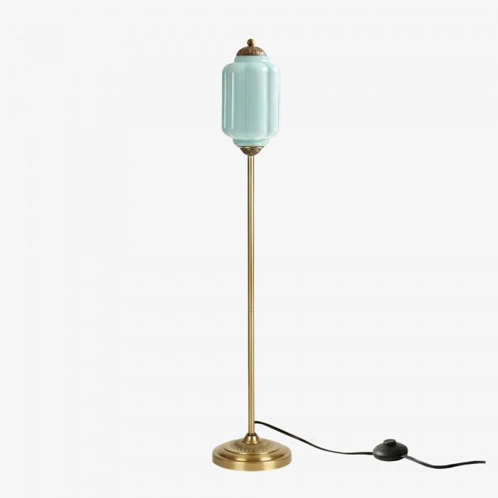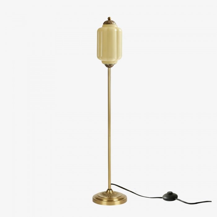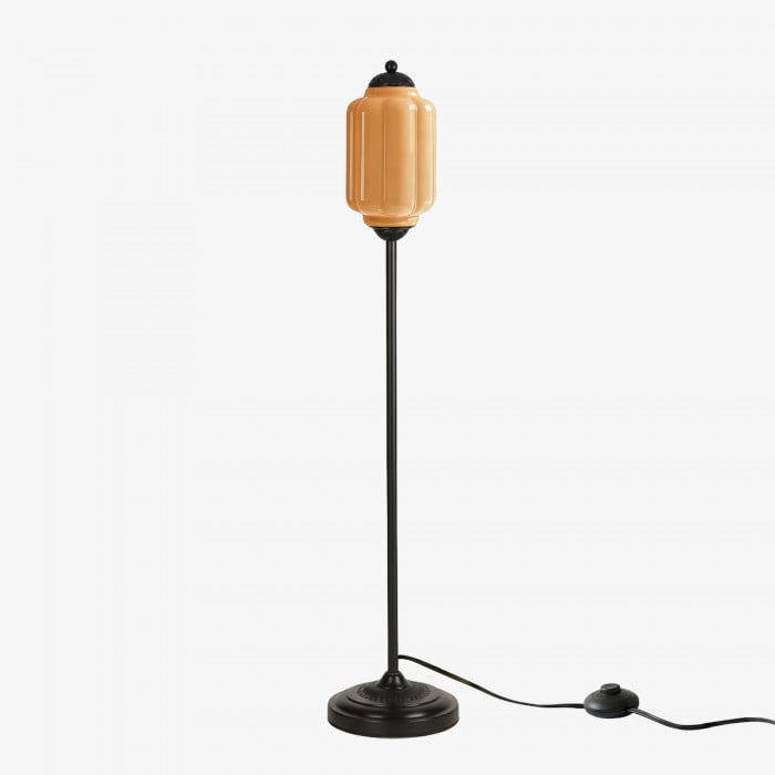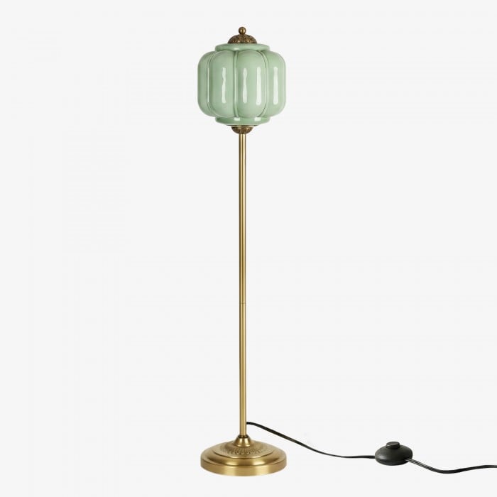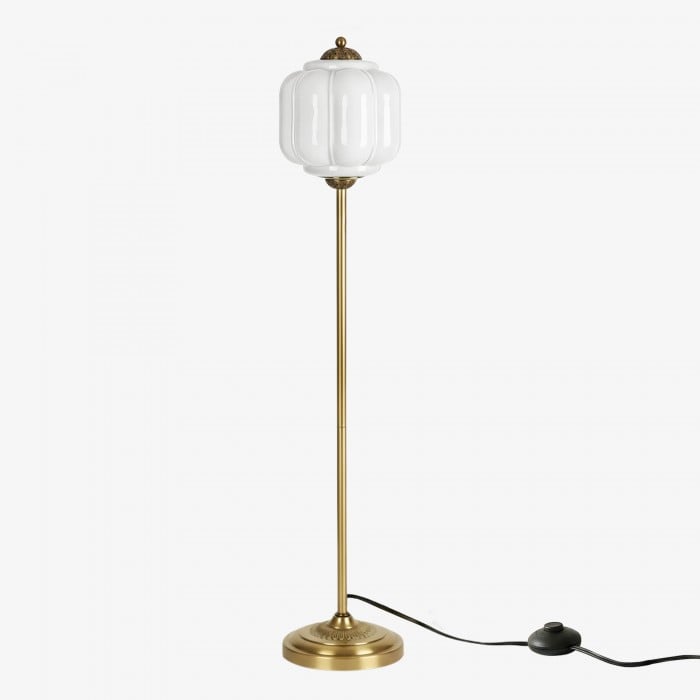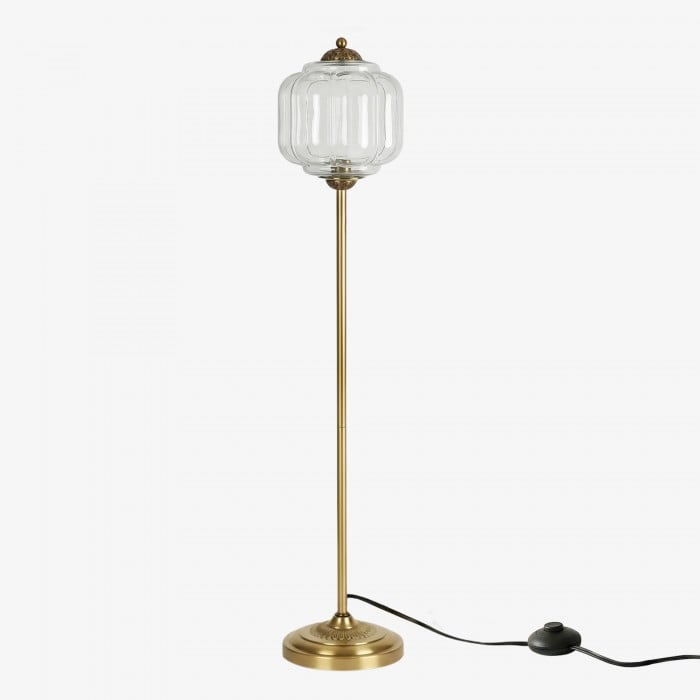 Lampa podłogowa Eloise łączy w sobie organiczny kunszt z ponadczasowym stylem retro. Wykonana z ręcznie dmuchanego, teksturowanego szkła i metalowego trzonu, ta inspirowana dynią lampa rzuca miękkie, rozproszone światło, które podkreśla piękno salonów, gabinetów i sypialni. Jej klosz ze szkła w stylu vintage tworzy płynne refleksy, a ciepłe mosiężne akcenty dodają odrobinę klasycznej elegancji.