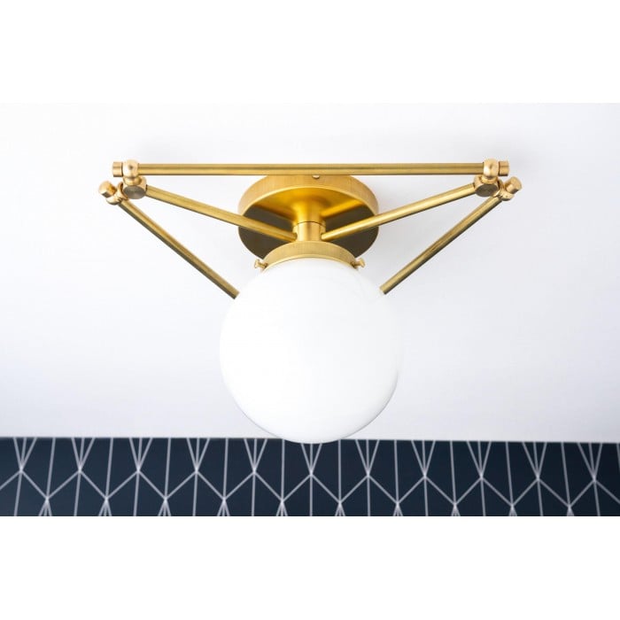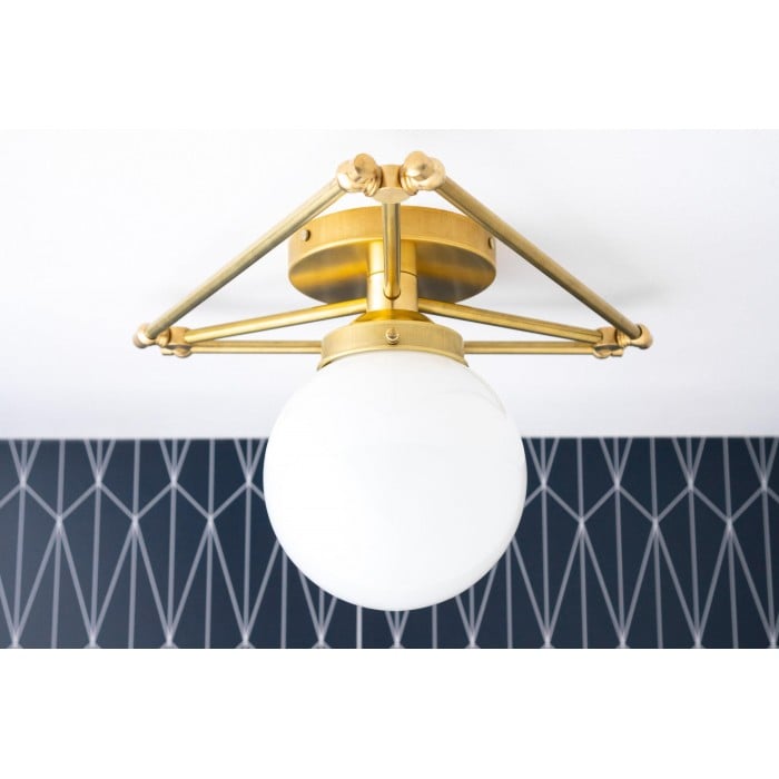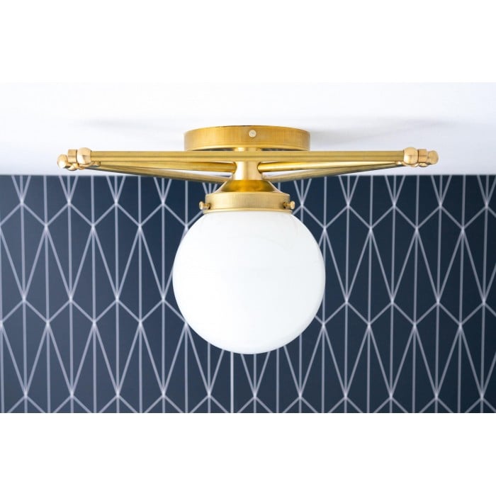 Odśwież swoją przestrzeń dzięki tej ręcznie wykonanej, nowoczesnej lampie sufitowej w stylu art déco. Jej ręcznie dmuchana kula o średnicy 15 cm i geometryczny wzór tworzą efektowny element wizualny. Wykończenie w surowym mosiądzu z czasem pokrywa się unikalną patyną, dodając charakteru każdemu wnętrzu. Idealna do nowoczesnych wnętrz, w których liczy się nuta organicznej elegancji.