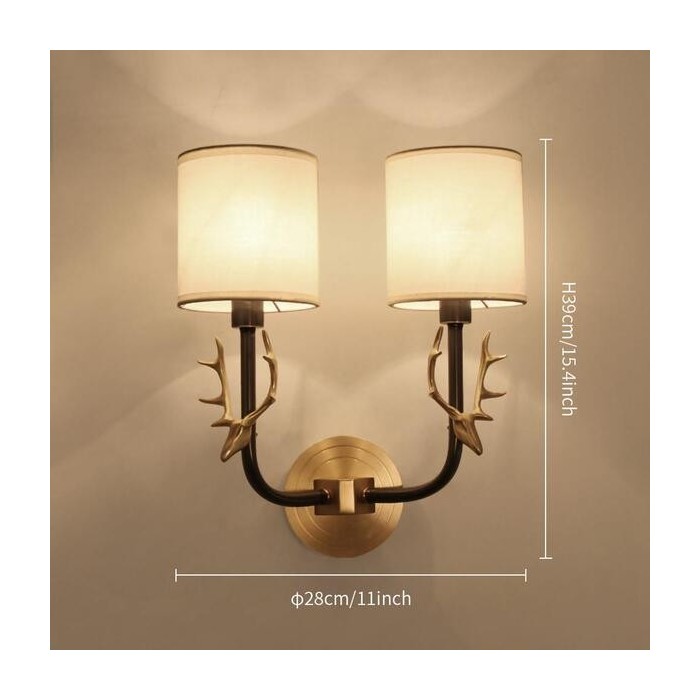 Mosiężna lampa ścienna z głową jelenia jest i abażur ze sztucznego jedwabiu. Ta dwugłowicowa lampa ścienna ma dwa światła, każde połączone z okrągłym tylnym panelem. Czyste linie miedzi nadają temu nowoczesnemu elementowi tradycyjnego charakteru.
