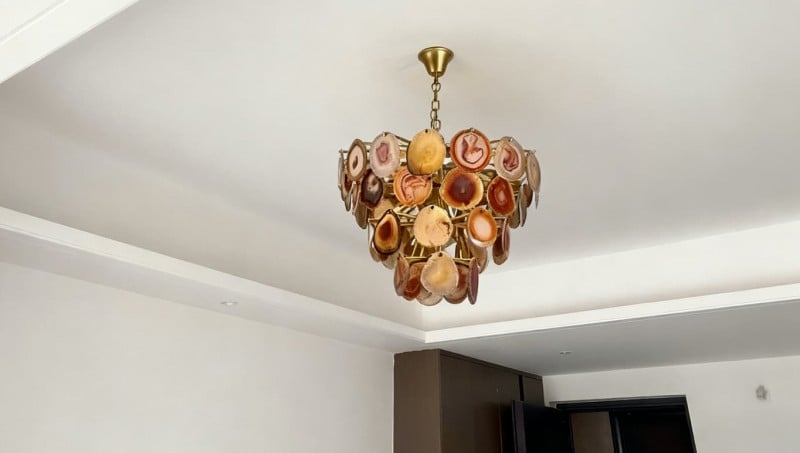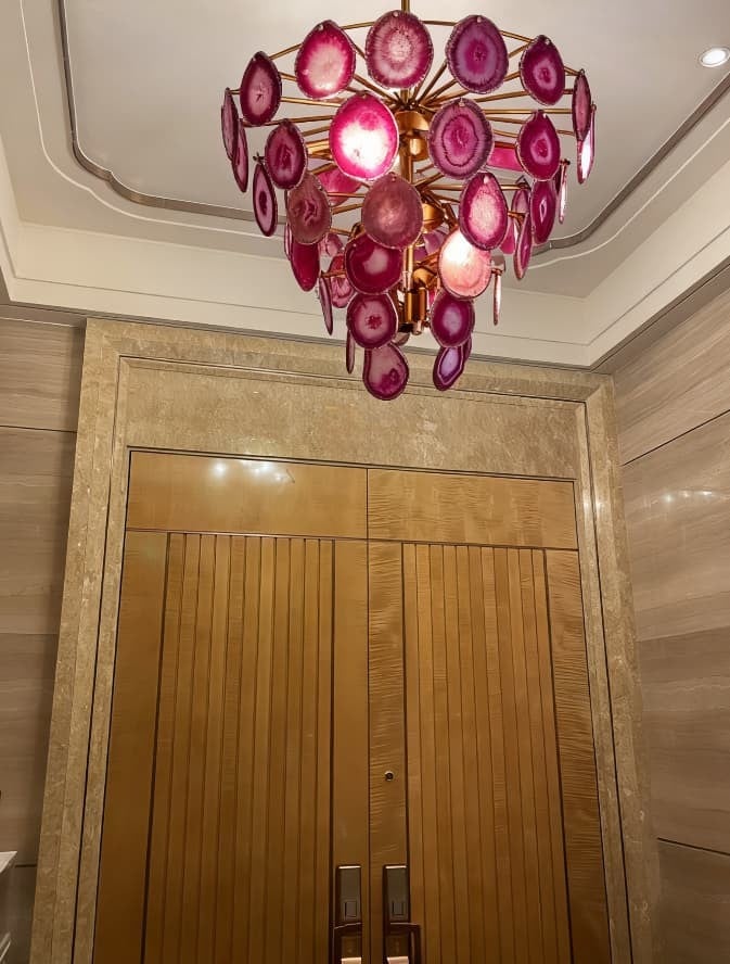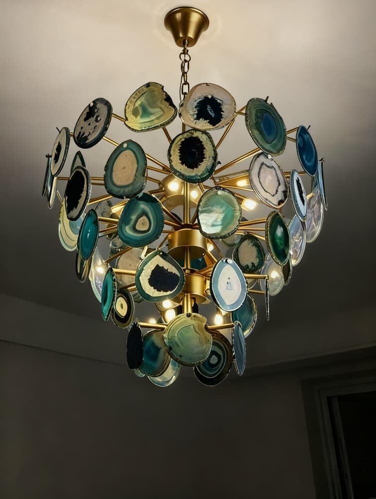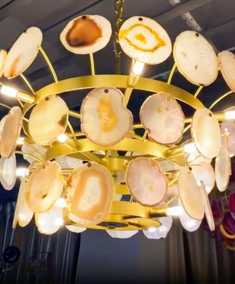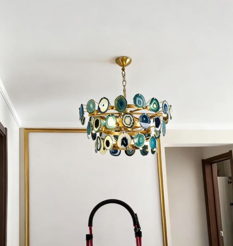 Żyrandol z pasty agatowej to luksusowy i kolorowy żyrandol. Naturalny surowy agat jest cięty, polerowany, perforowany i wykonany. Agat ma jasny kolor i gładką powierzchnię. Ma silną transmisję światła i nie oślepia. Metalowa rama wykonana jest z metalu, spawania, szlifowania, galwanizacji itp. Żyrandol z pasty agatowej ozdobi i rozjaśni każde pomieszczenie w Twoim domu.
