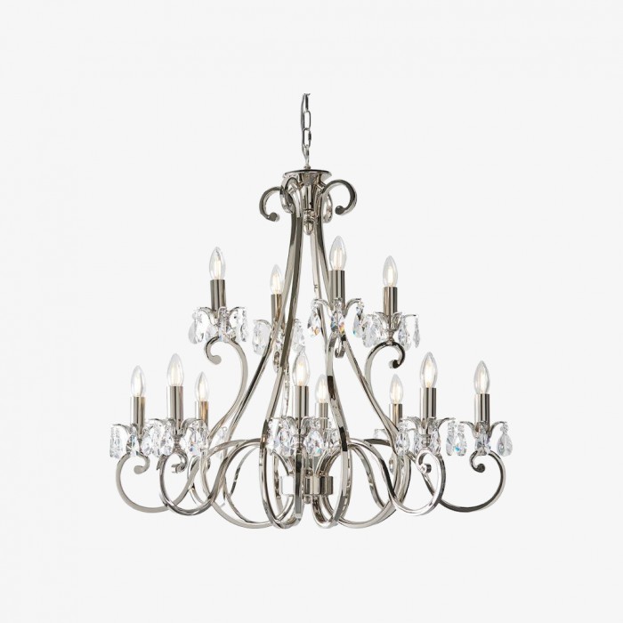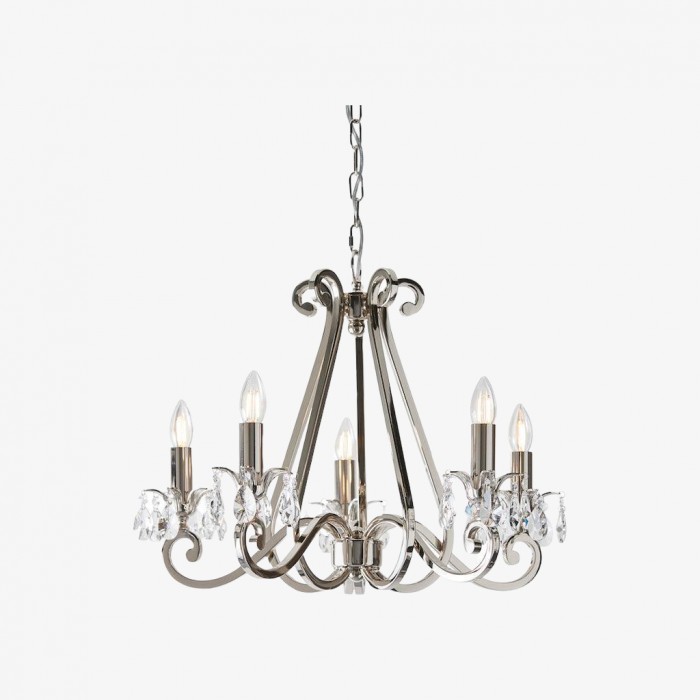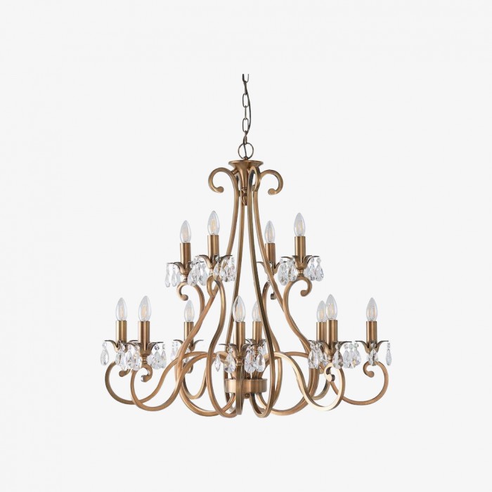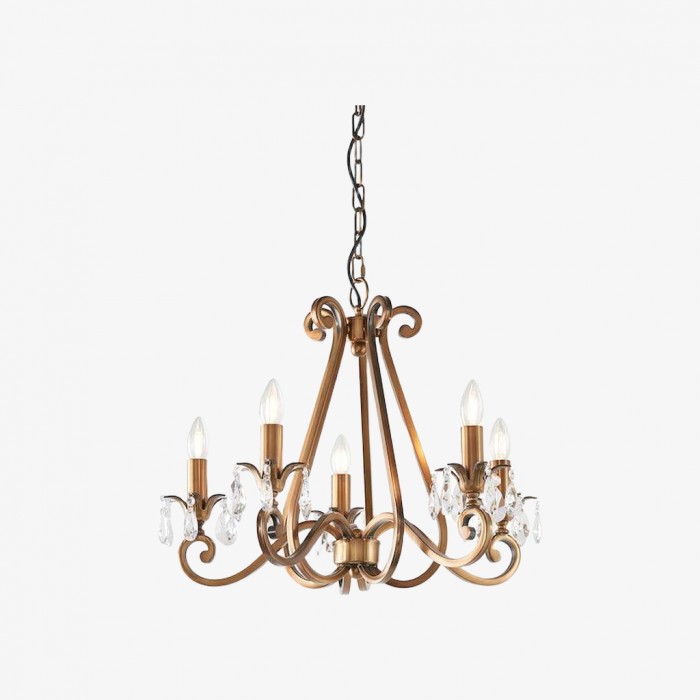 Ta wyjątkowa lampa charakteryzuje się wdzięcznie rozłożonymi ramionami, ozdobionymi delikatnymi kryształowymi kropelkami i kloszami, które mienią się każdym odbiciem. Regulowany łańcuch pozwala na uniwersalny montaż w salonach, jadalniach lub wysokich przedpokojach, emanując ciepłą i zachęcającą poświatą.