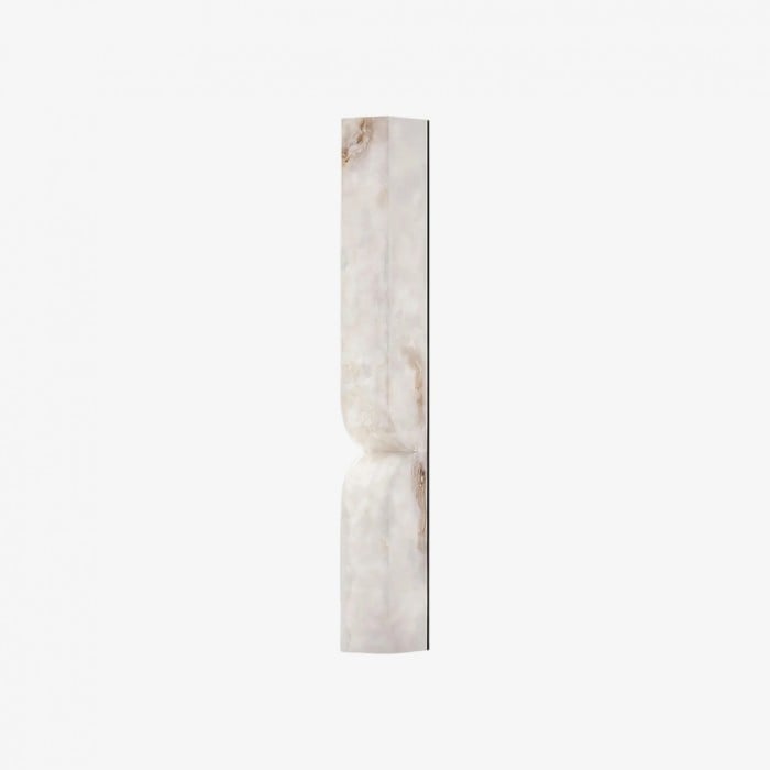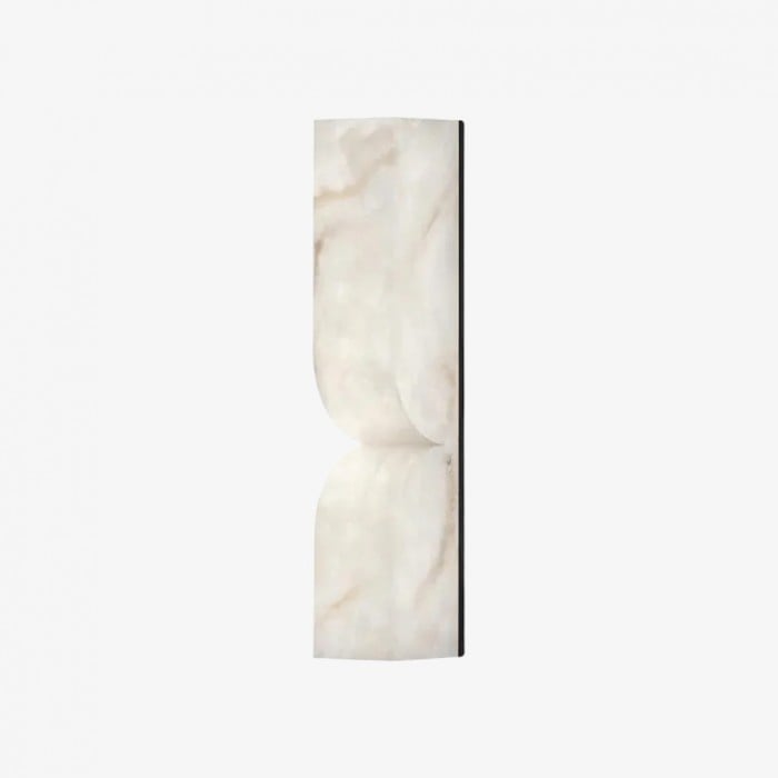 Deze wandlamp is vervaardigd uit steen en verfijnd metaal. Het slanke silhouet en de zacht gebogen binnenwanden creëren een subtiel spel van licht en schaduw, wat diepte en serene elegantie toevoegt aan elke binnenruimte.