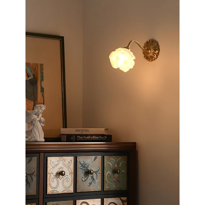 Deze prachtige Brass Rose Wall Light straalt tijdloze schoonheid uit. Gemaakt van messing met een rozenknopvorm, is deze wandlamp een elegante en stijlvolle verlichtingskeuze voor elke kamer. Het is een perfecte mix van moderne en traditionele esthetiek.