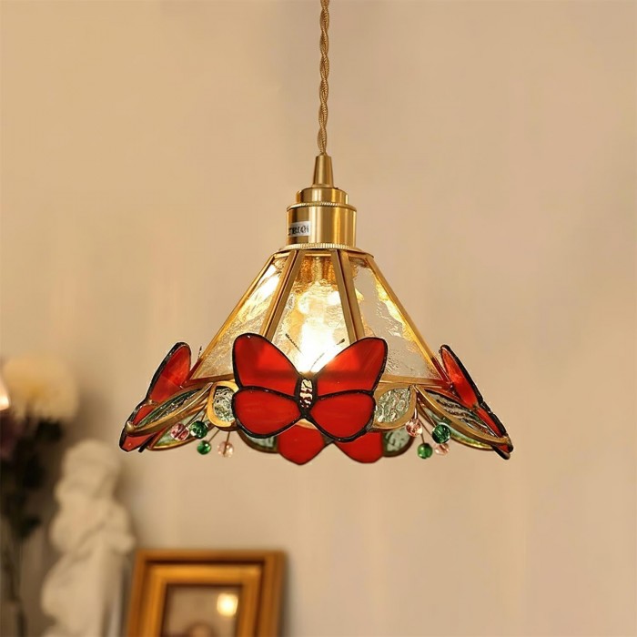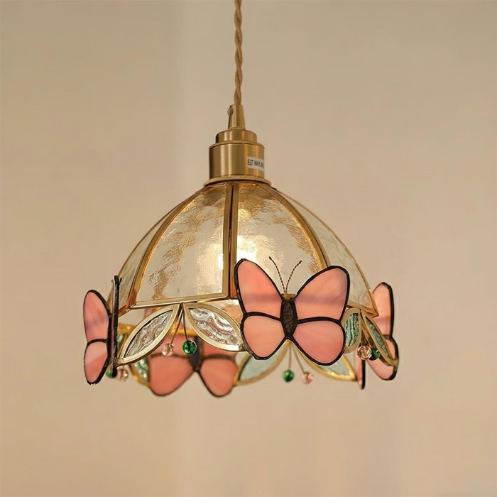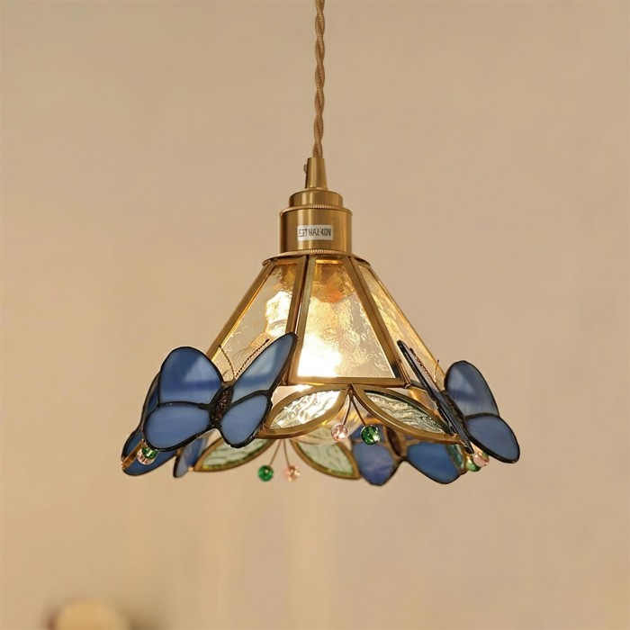 De Butterfly Jewel hanglamp vangt de betovering van de natuur in beweging – een delicate dans van licht en kleur. Handgemaakt met vleugels van gebrandschilderd glas en details die op edelstenen lijken, lijkt elke vlinder zachtjes rond het gouden frame te fladderen en een zachte, romantische gloed te verspreiden. Deze lamp voegt een vleugje speelsheid en kunstzinnigheid toe aan elke ruimte, transformeert verlichting in poëzie en alledaagse momenten in iets magisch.