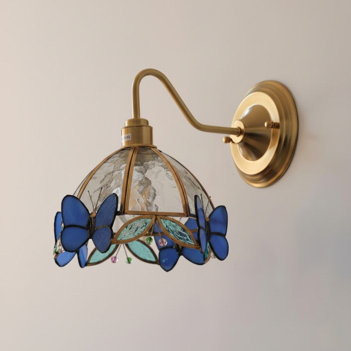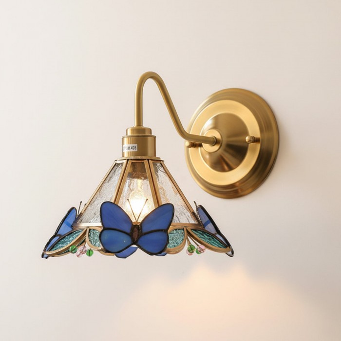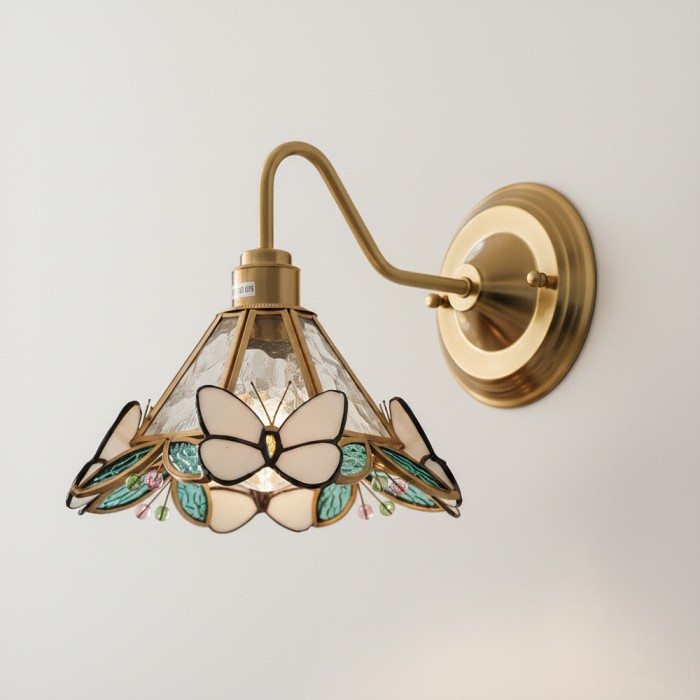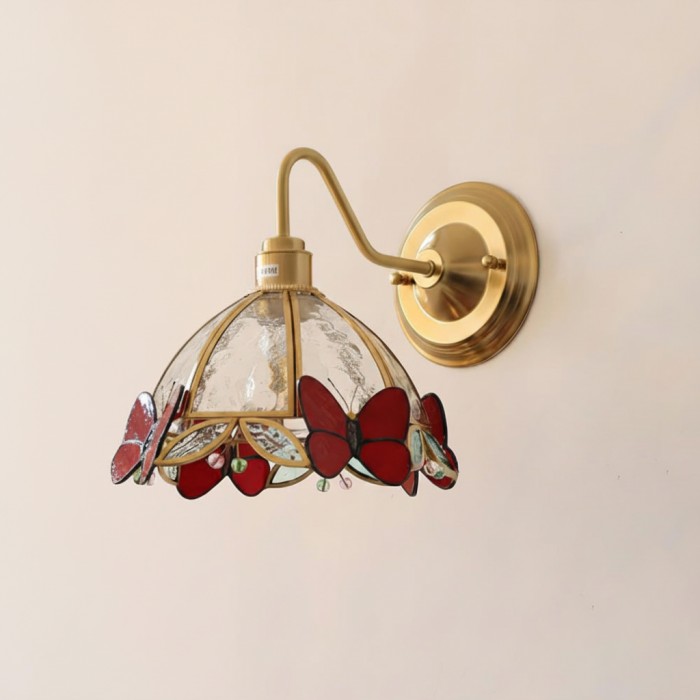 De Butterfly Jewel wandlamp is een poëtische samensmelting van licht en vakmanschap, waarbij delicate vlinders van gebrandschilderd glas rusten op een gouden frame, alsof ze midden in de vlucht zijn gevangen. Elke vleugel glinstert met doorschijnende tinten, die de warme gloed binnenin reflecteren en een subtiel spel van schaduw en kleur op de muur creëren. Meer dan een lamp, het is een kunstwerk dat alledaagse hoekjes transformeert in momenten van serene schoonheid en tijdloze charme.
