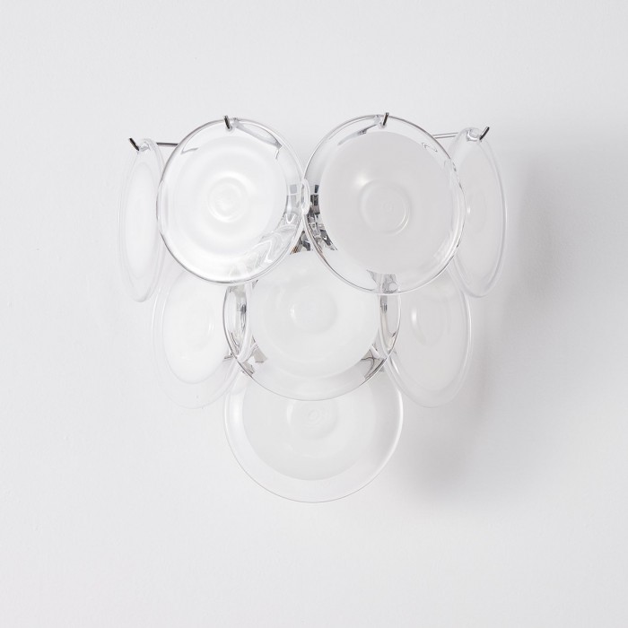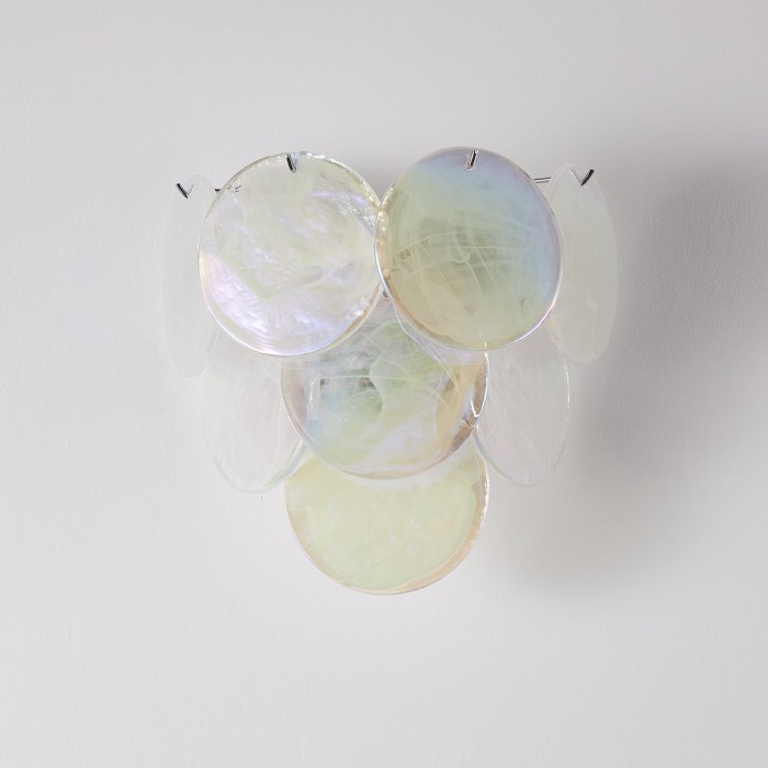 De Celestial Flow wandlamp is een artistiek meesterwerk, geïnspireerd op de vloeiende beweging van water en de schoonheid van de kosmos. Het unieke ontwerp bestaat uit een cluster van iriserende glazen schijven, elk met betoverende wervelende patronen in tinten blauw, groen en paars. Het zachte, diffuse licht creëert een betoverende gloed en versterkt de sfeer van elke ruimte met een vleugje elegantie en verfijning.